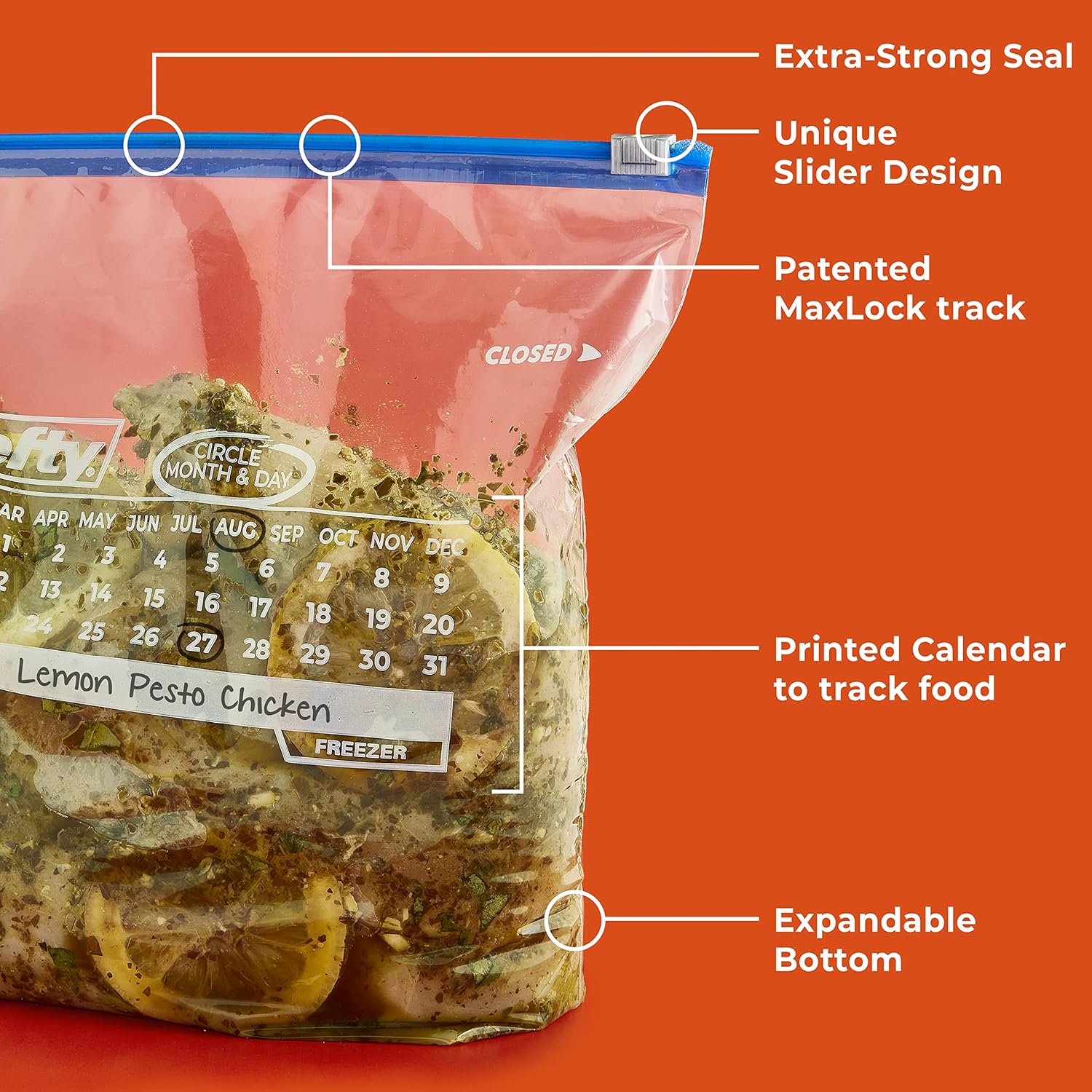 - Gallon Size Calendar Freezer Bags-This pack includes 4 boxes of 25 Hefty Slider Gallon Freezer Bags (100 Total)