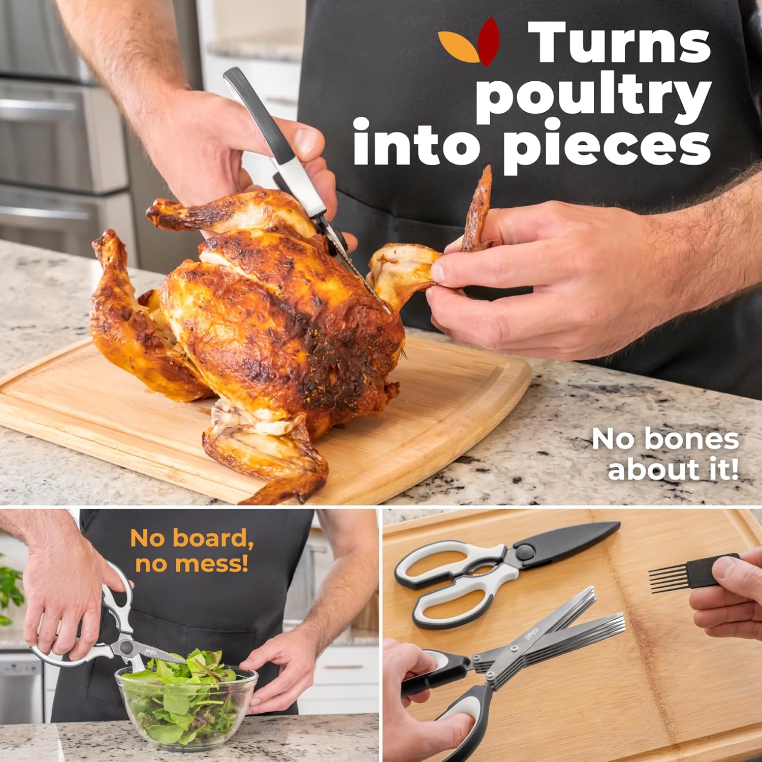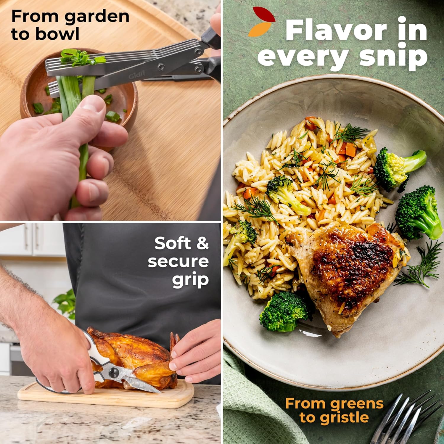 - TWO-IN-ONE KITCHEN SHEARS & HERB SCISSORS - ALL-PURPOSE CUTTING POWER - This kitchen scissors all-purpose set includes heavy-duty kitchen shears for poultry, meat, and tough cuts, plus herb scissors for kitchen with five ultra-sharp blades for mincing basil, parsley, and cilantro fast. Whether you need kitchen scissors for food or utility scissors for everyday prep, these scissors for kitchen deliver clean, precise cuts.