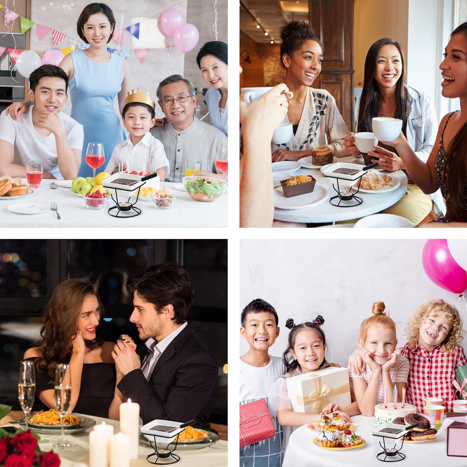 - When & Where You Will Use: You can fill eachfondue pot with drawn butter,garlic butter,chocolate,cheese,carmel dip and enjoy your dinner with eating strawberry, pineapple,cookies,marshmallows ect.Let's imagine that you used a fondue fork to dip a strawberry into the butterscotch and the melted butterscotch made a nice coat on the strawberry. What a nice night in the Christmas,Birthday,Valentine’s Day,Slumber Party.