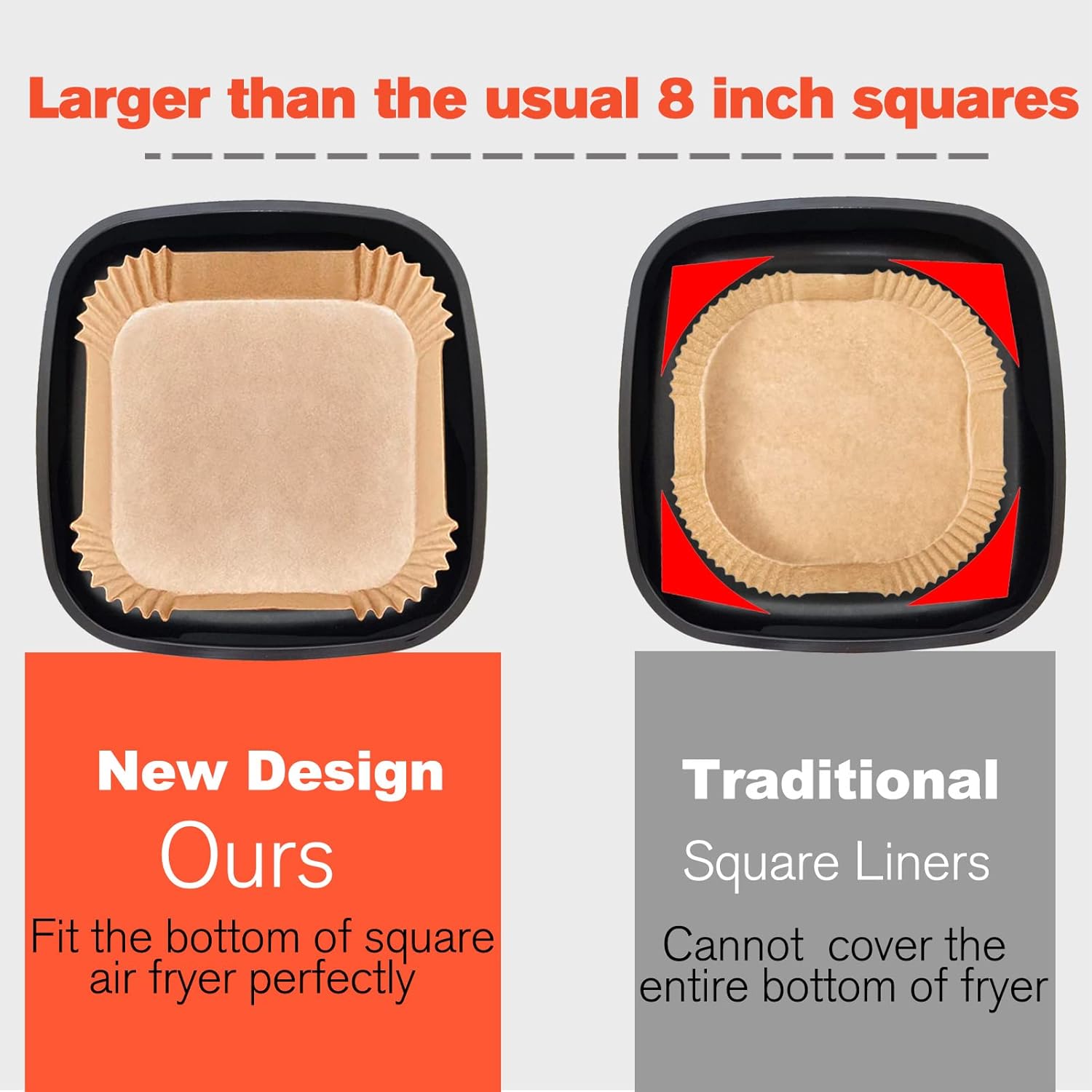 - 【Info】Large Size. Air Fryer Liners 9 inch Square. Square air fryer liners disposable are designed with a square bowl shape. Upper size 9 inches, bottom size 8 inches, perfects for 5-8 quart air fryer.