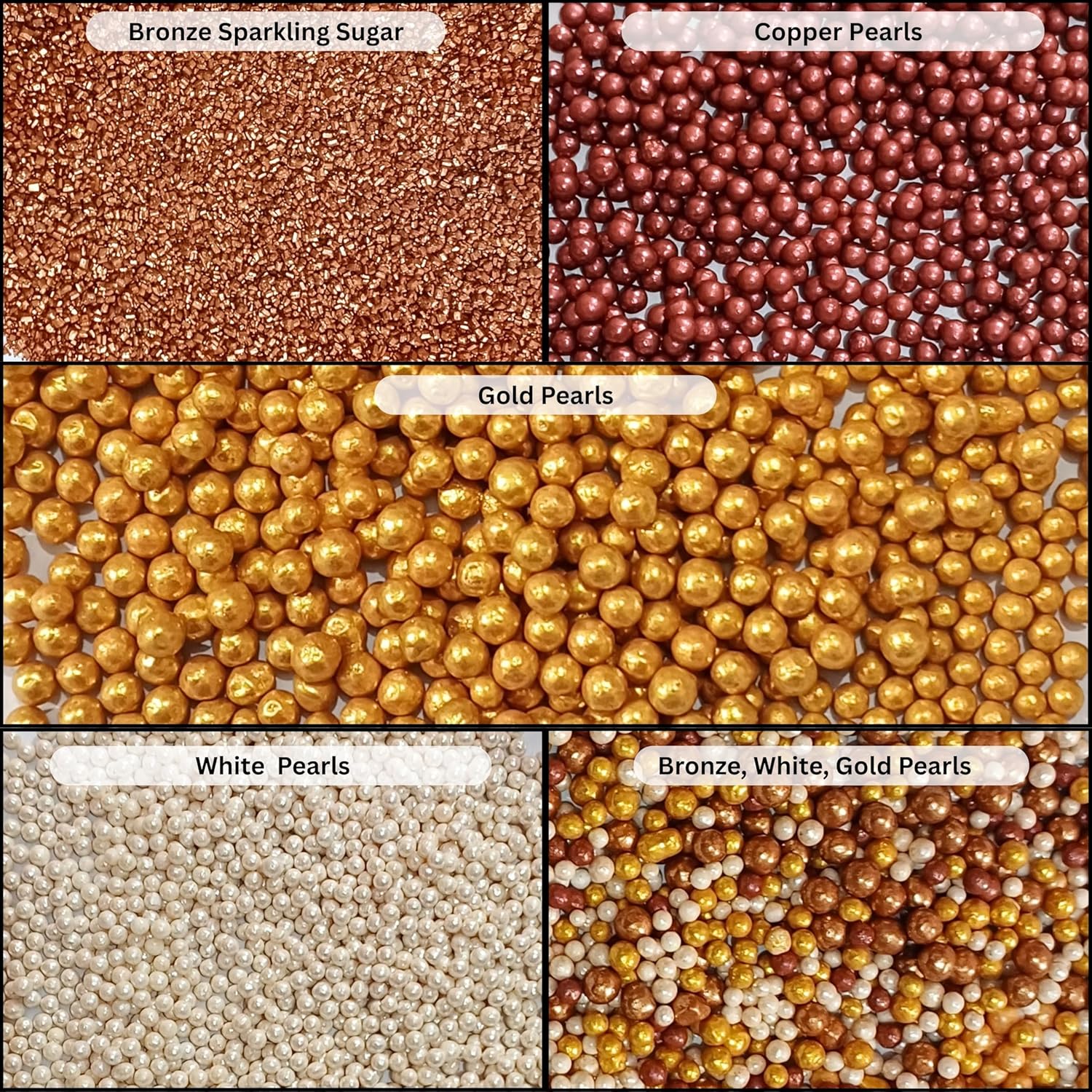 - Elegant Gatsby-Inspired Sprinkle Mix – Features a luxurious blend of gold, bronze, and white edible pearls with copper sparkling sugar, perfect for upscale events and stylish desserts.