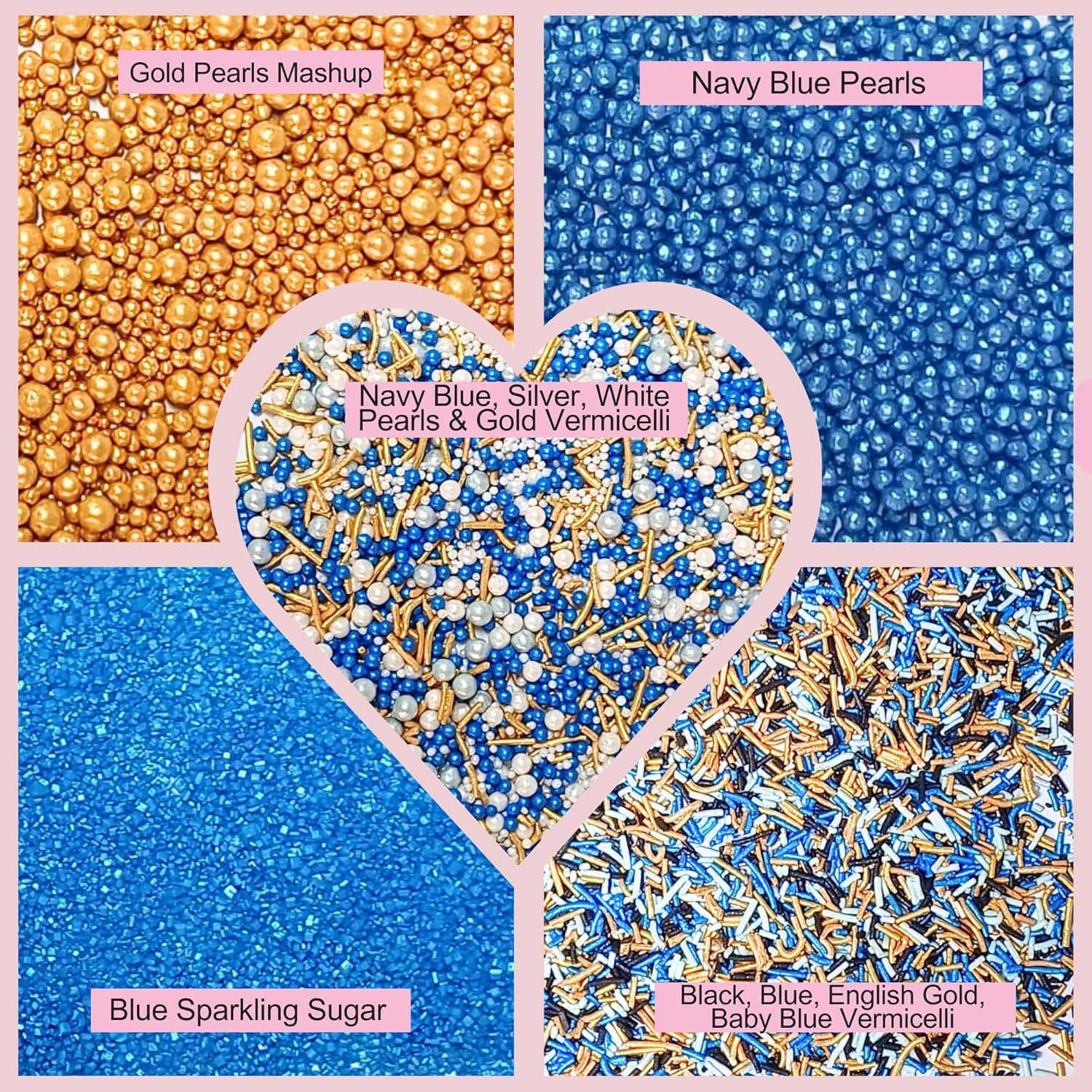 Confect Edible Sprinkles – Marine Royalty Theme – Assorted Pack with Navy Blue & Champagne Gold Dragees, Gold Jimmies & Bright Blue Sparkling Sugar – Sprinkles for Cake Decorating- Vegan, Gluten-Free, Nut-Free, Soy-Free, Dairy-Free, Palm Oil-Free-5 Oz
