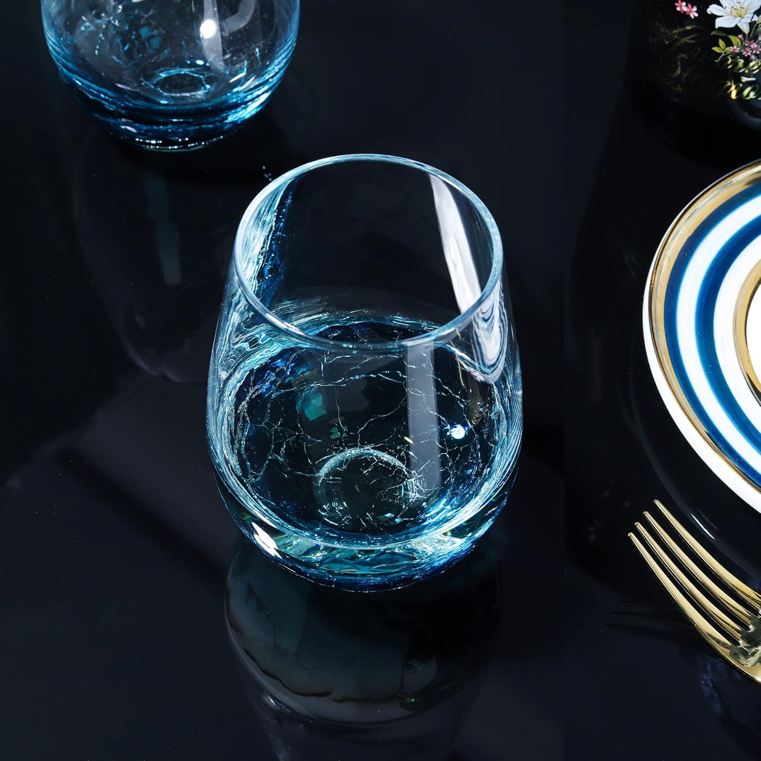 - Unique Blue Ice Crackle Design: This blue crackle stemless wine glass cup set is sophisticated and pretty. To make the blue crackle effect, we need prepare 2 stoves, one for transparent materials and the other for blue colored materials. A skilled blower will need blow, beat, merge and adjust, and each step needs skill, speed and control. Because of the special craftsmanship, it is more of an artwork than an ordinary crystal wine glass, with display and collection value.