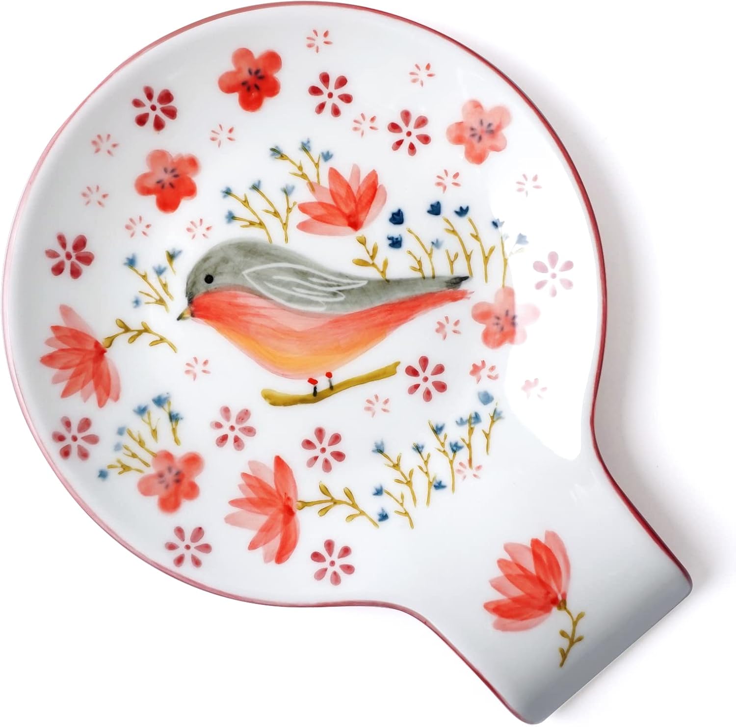 Hand Painted Spoon Rest, 5.5" Ceramic Spoon Holder for Stove Top and Kitchen Counter, Red Spring Bird Utensil Rest, Great Cooking Gifts for Bird Lover/Friend, Modern Kitchen Decorative