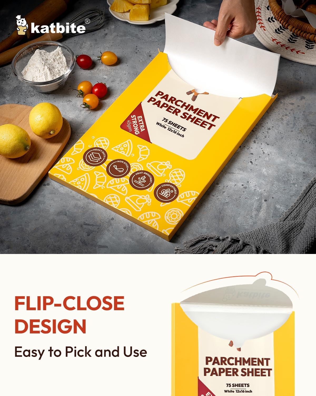 Katbite 75Pcs White Parchment Paper Sheets 12x16IN, Pre-Cut Heavy Duty Parchment Baking Paper, Non-Stick Half Sheet White Baking Parchment Paper for Air Fryer, Baking Cookie Pans[Advanced Series]