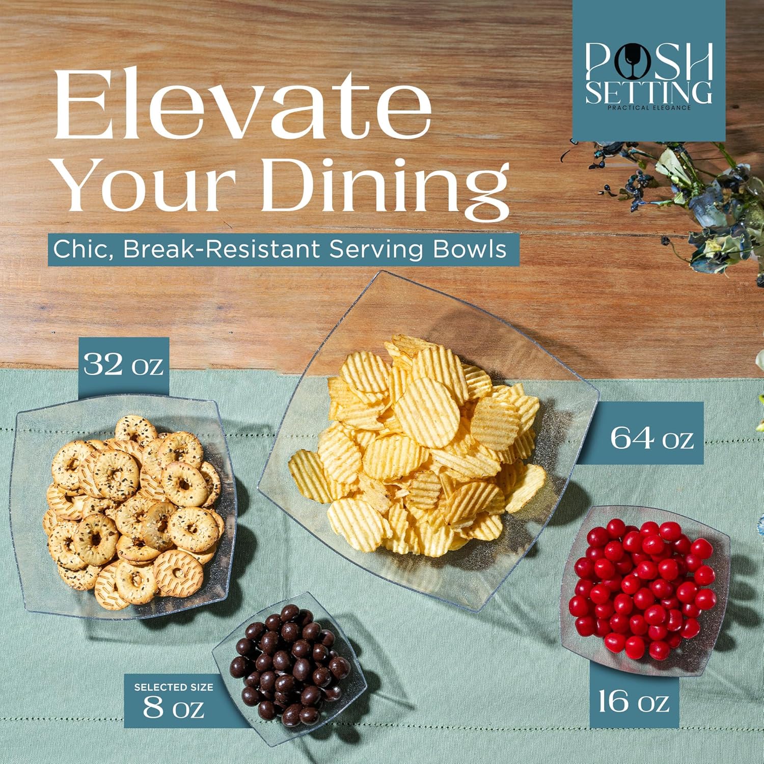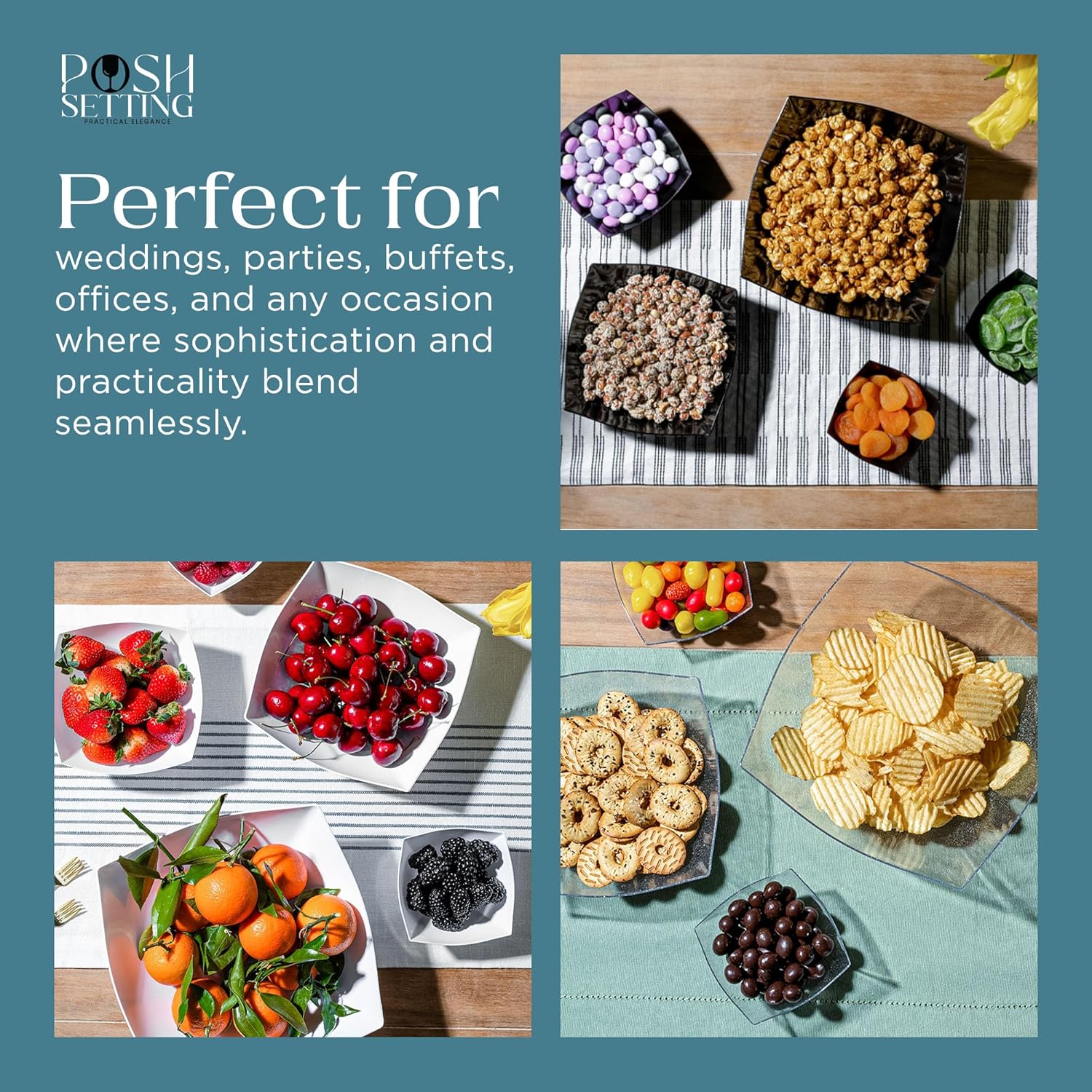 Posh Setting - Silver Glitter Plastic Serving Bowls for Party (8oz - 4 Pack) Square Bowls, Disposable Chip Bowls, Candy Bowls for Party Table, Salad Bowls for Party, Candy Containers for Candy Buffet