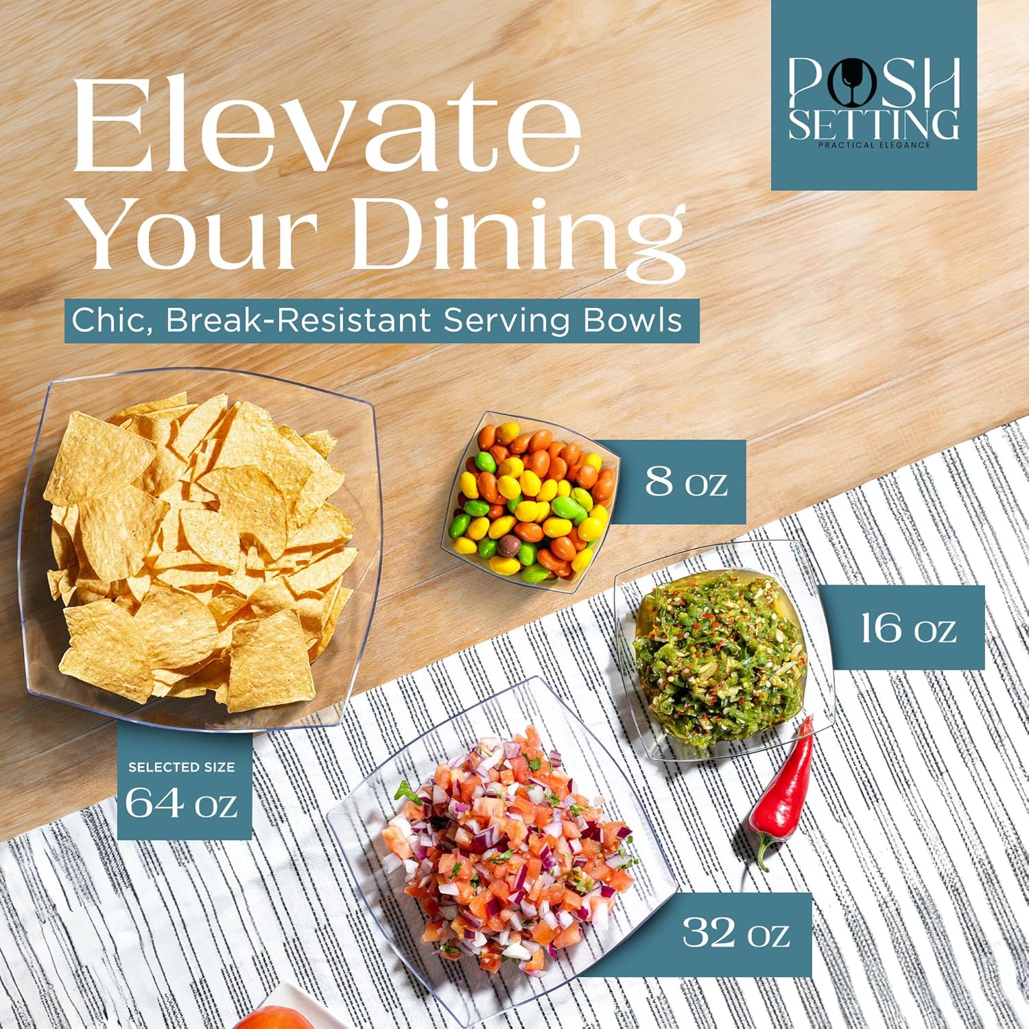Posh Setting - Clear Plastic Serving Bowls (64oz - 4 Pack) Square, Disposable, Candy & Fruit Bowls for Party Table, Candy Containers
