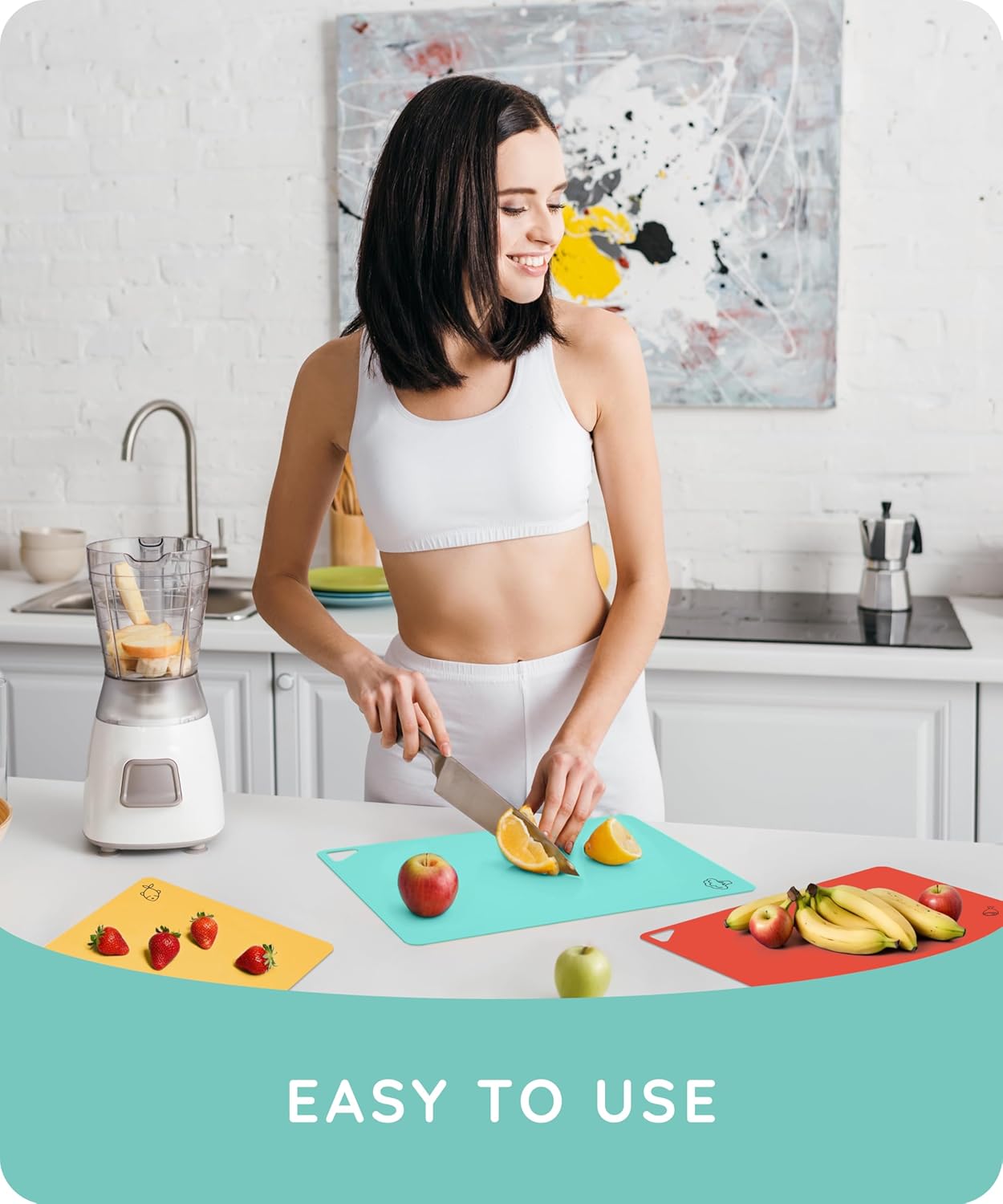 - 🎨 COLOR-CODED! You’ll be pleased to notice that we have strategically color-coded our cutting board mats. Safely use our plastic cutting board set for slicing fruit, chopping veggies, and even as a cutting board for meat carving.