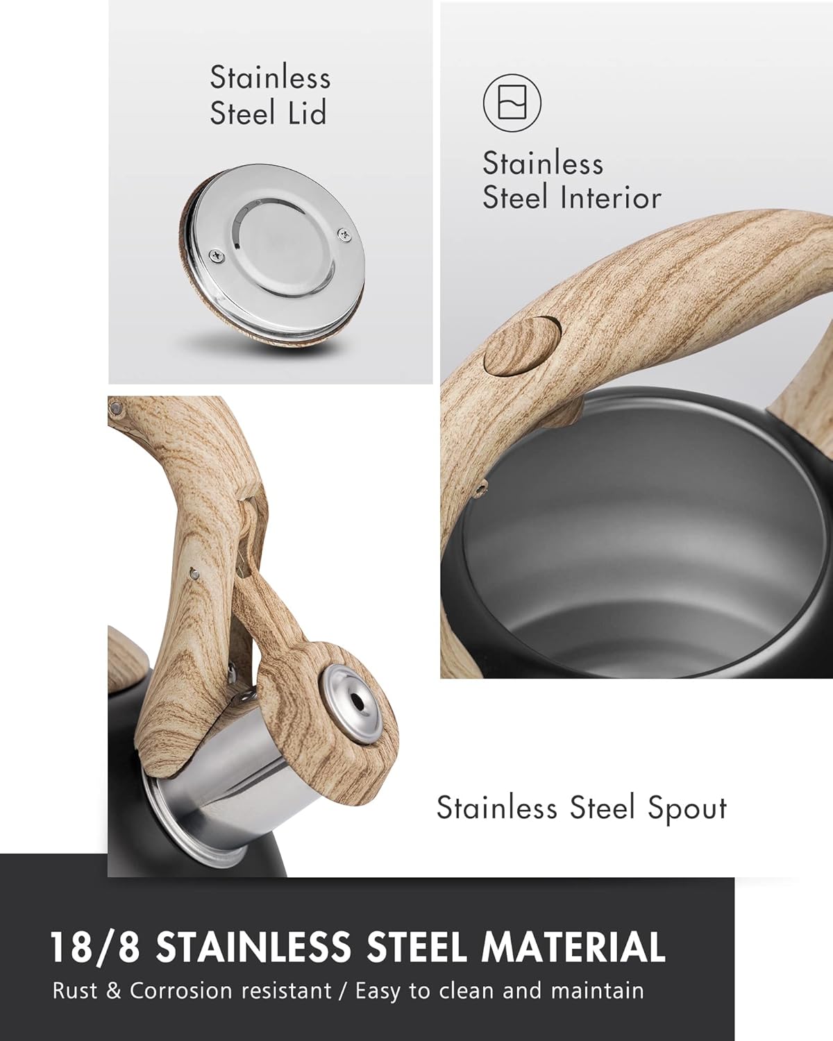 - Anti-Rust Finish: Stylish tea kettle electroplated for longevity. Professional food grade finish and 18/8 stainless steel craftsmanship, ensures this kettle is rust & corrosion resistant.