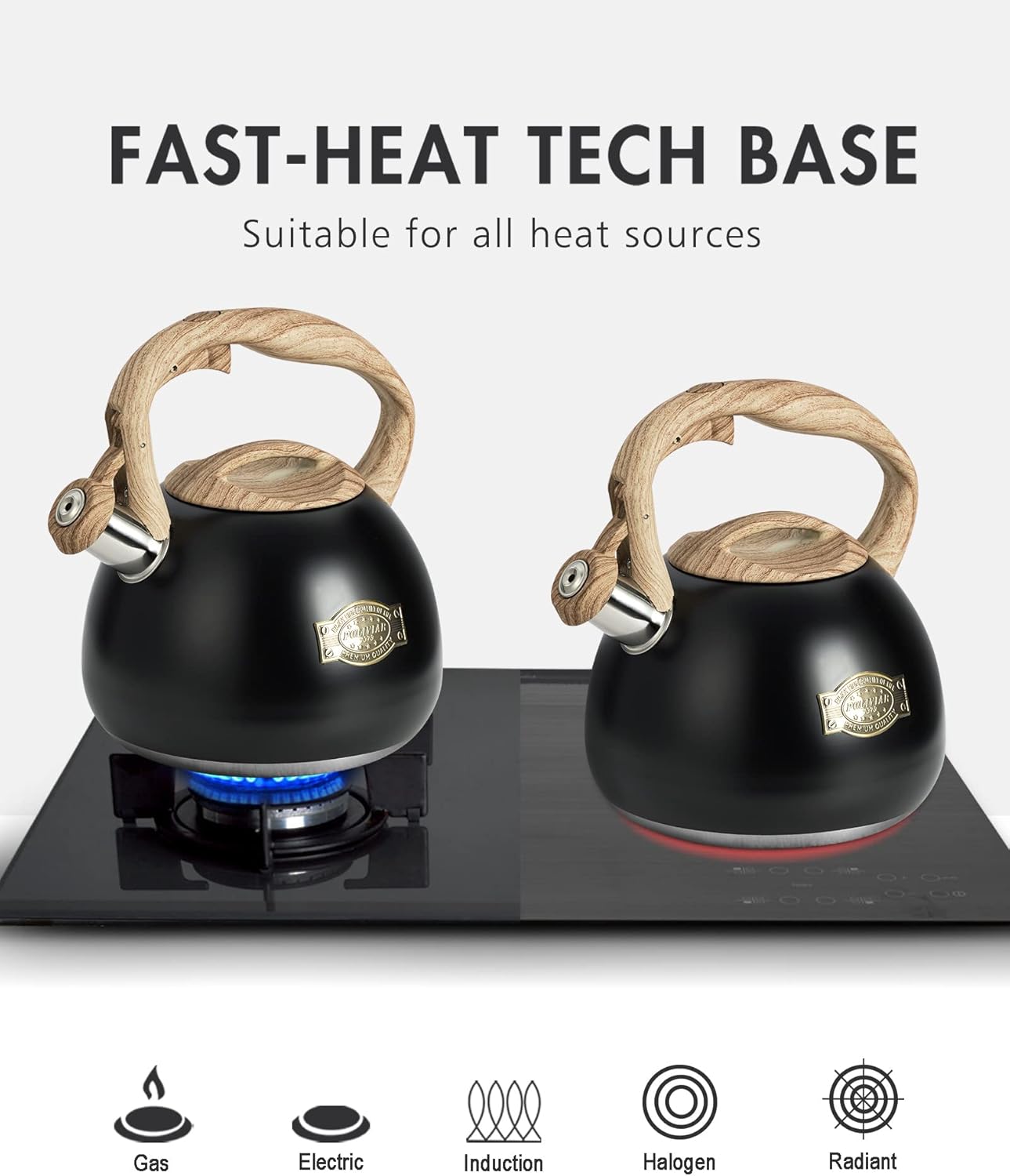 - Fast Heat Base: The tea kettle designed with a generous 8 in base can maximize the heat conduction to increase the efficiency of boiling. High grade stainless steel is suitable for any heat source including gas, electric and induction.