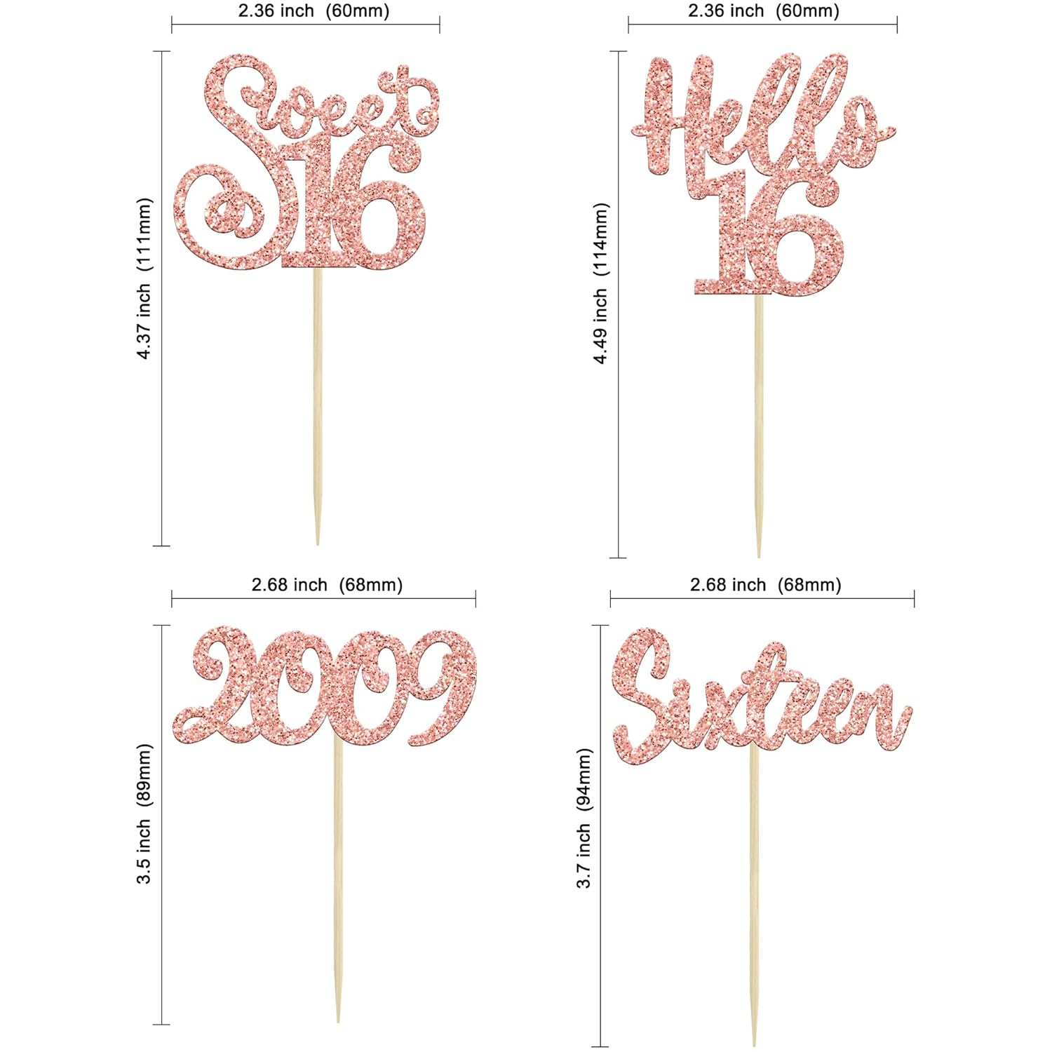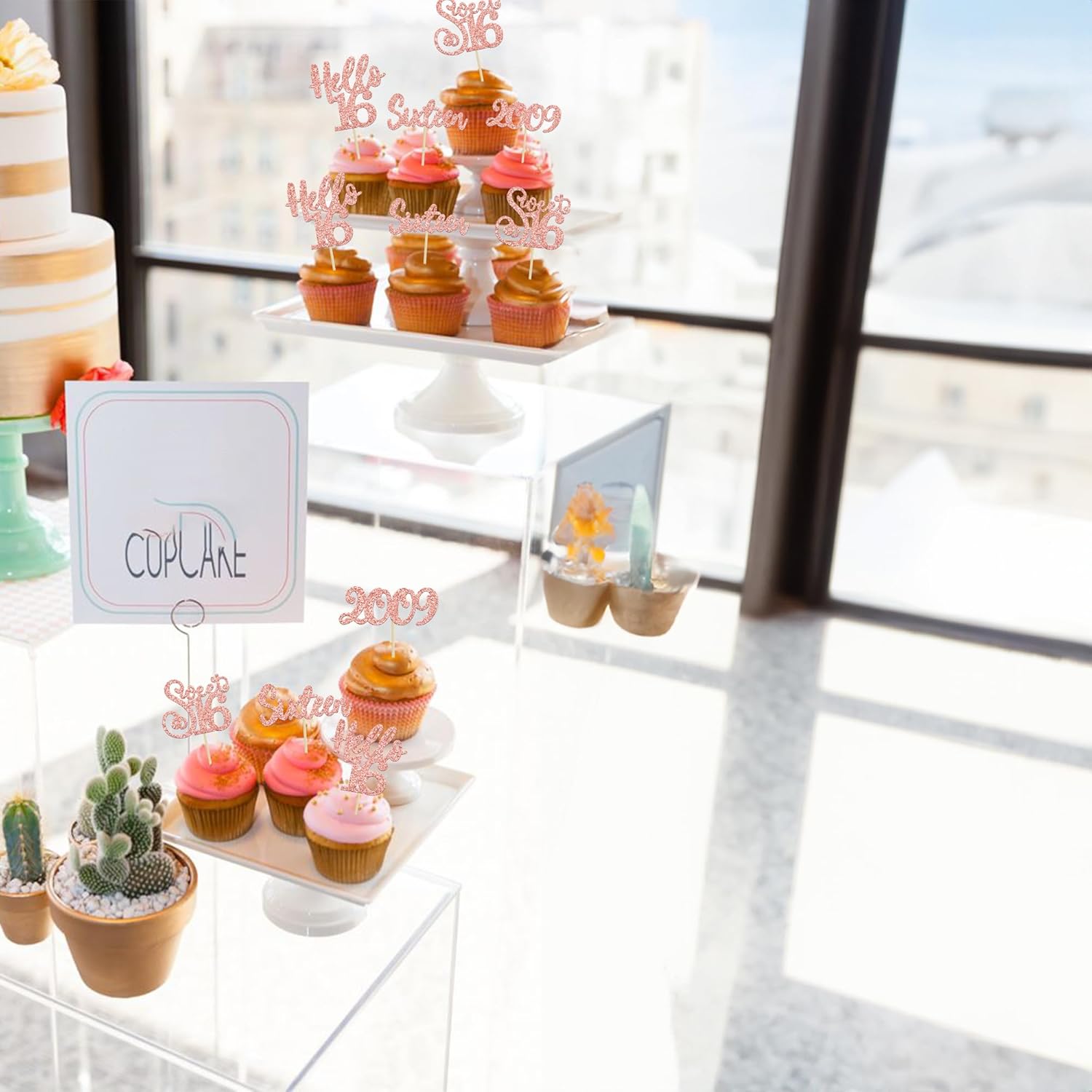 Gyufise 24pcs 16th Birthday Cupcake Toppers - Rose Gold Glitter Hello Sweet 16 Cupcake Picks - 2009 16th Birthday Cake Decorations for Anniversary Party Supplies
