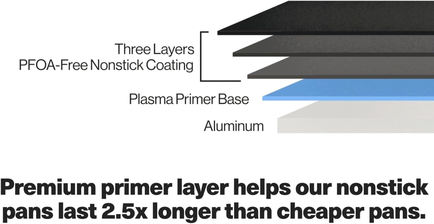 - Premium Nonstick Coating: Three layers of PFOA-free, platinum-grade nonstick ensure long-lasting performance, making cooking and cleanup effortless.