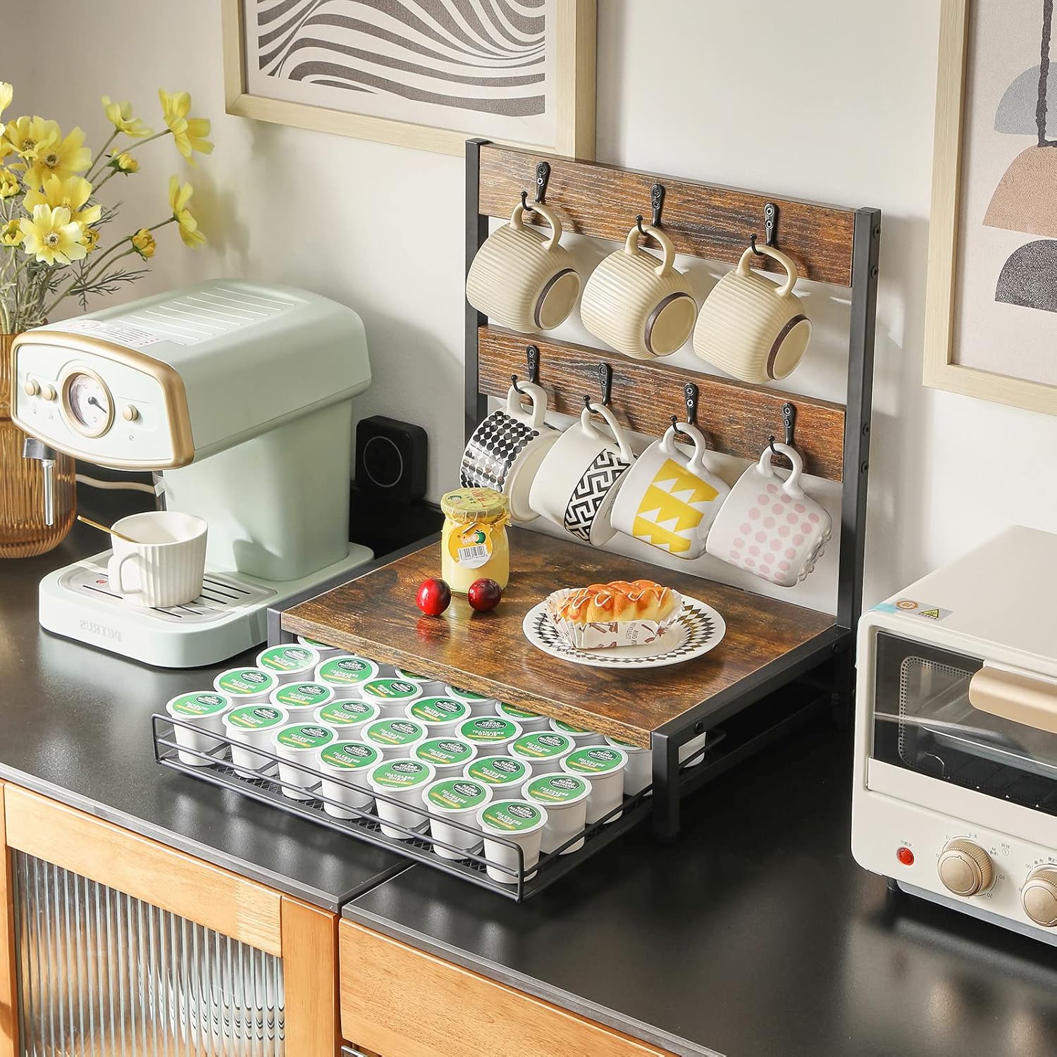 - Multi function: The product can store coffee capsules and mugs, and the panel can also be used as the storage space for coffee beans or coffee machine. The cup holder can hang seven cups of water, and the drawer can store 30-40 capsules of coffee.
