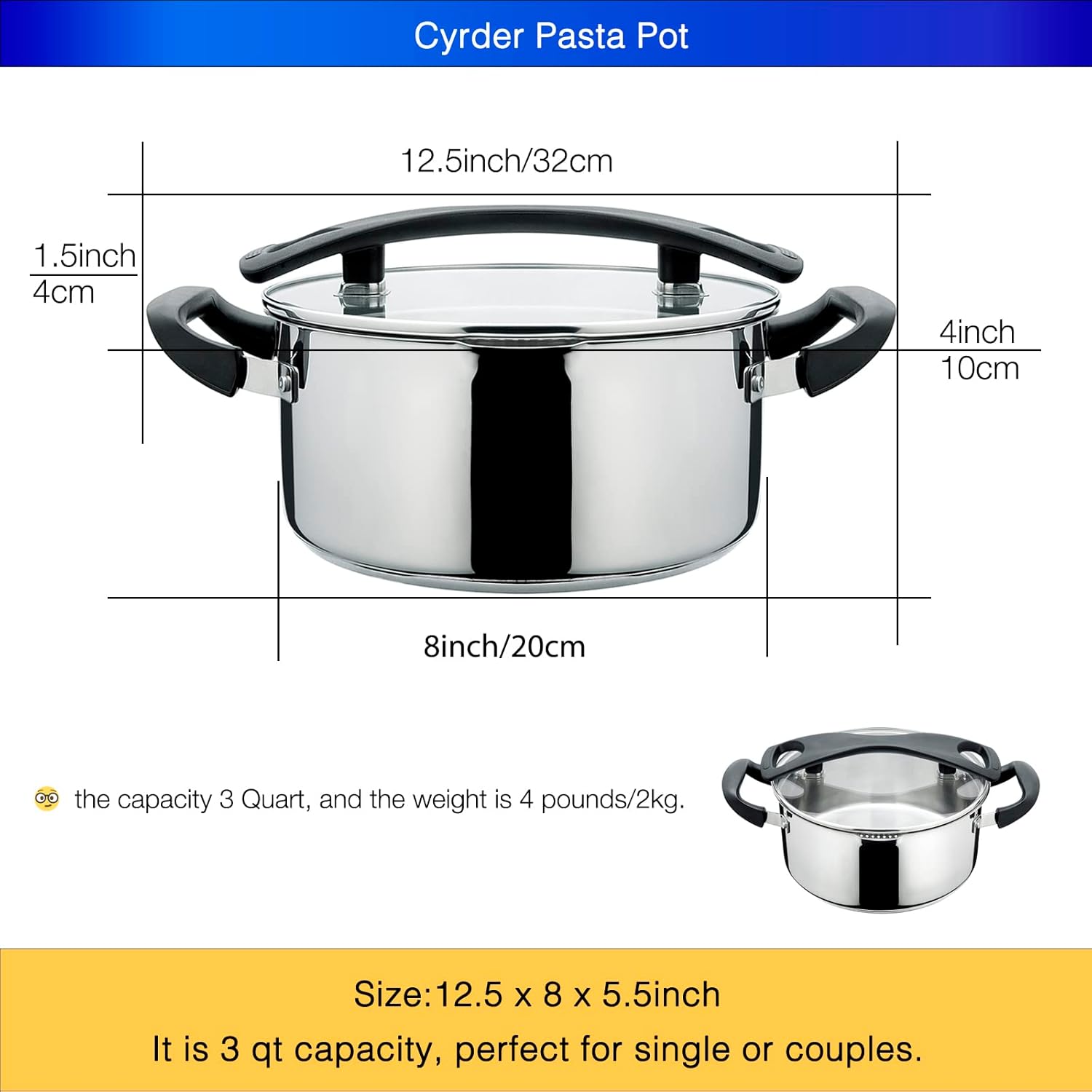 Stainless Steel Pasta Pot- Induction Pasta Pot with Strainer, Easy Stain &Perfect for Single and Couple, Dishwasher Safe, 3 Quart