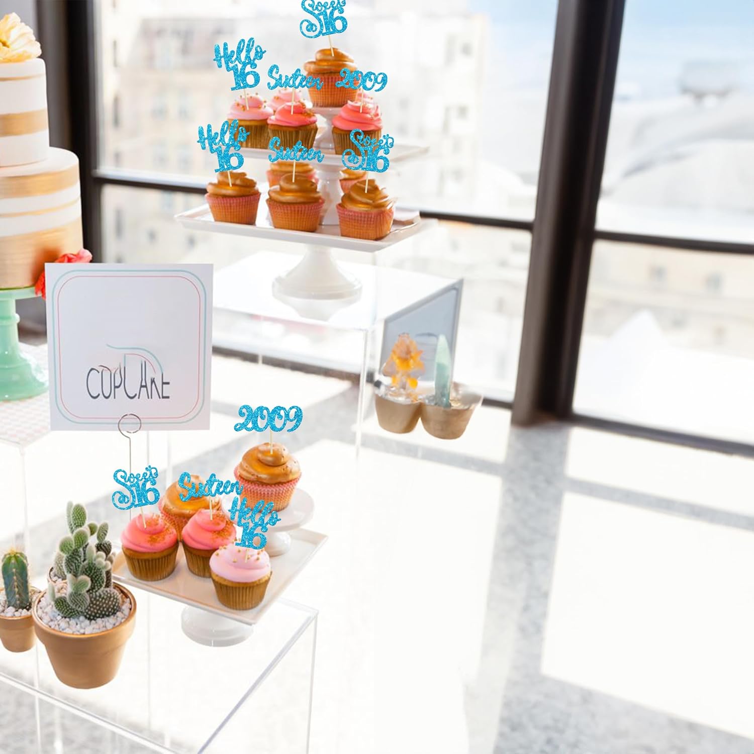 Gyufise 24Pcs Happy 16th Birthday Cupcake Toppers Glitter Hello 16 Sweet 16 Cupcake Picks Sixteen Years Old Birthday Cake Decorations for Celebrating 16th Birthday Anniversary Party Supplies Blue