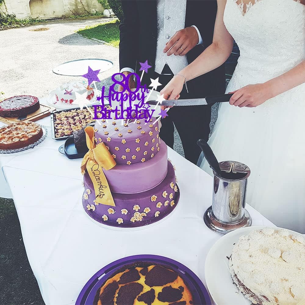 Glittery 80th Happy Birthday Cake Topper with Star,Personalised 80 Birthday Cake Toppers Party Decorations Party Supplies for Men Women Purple Silver