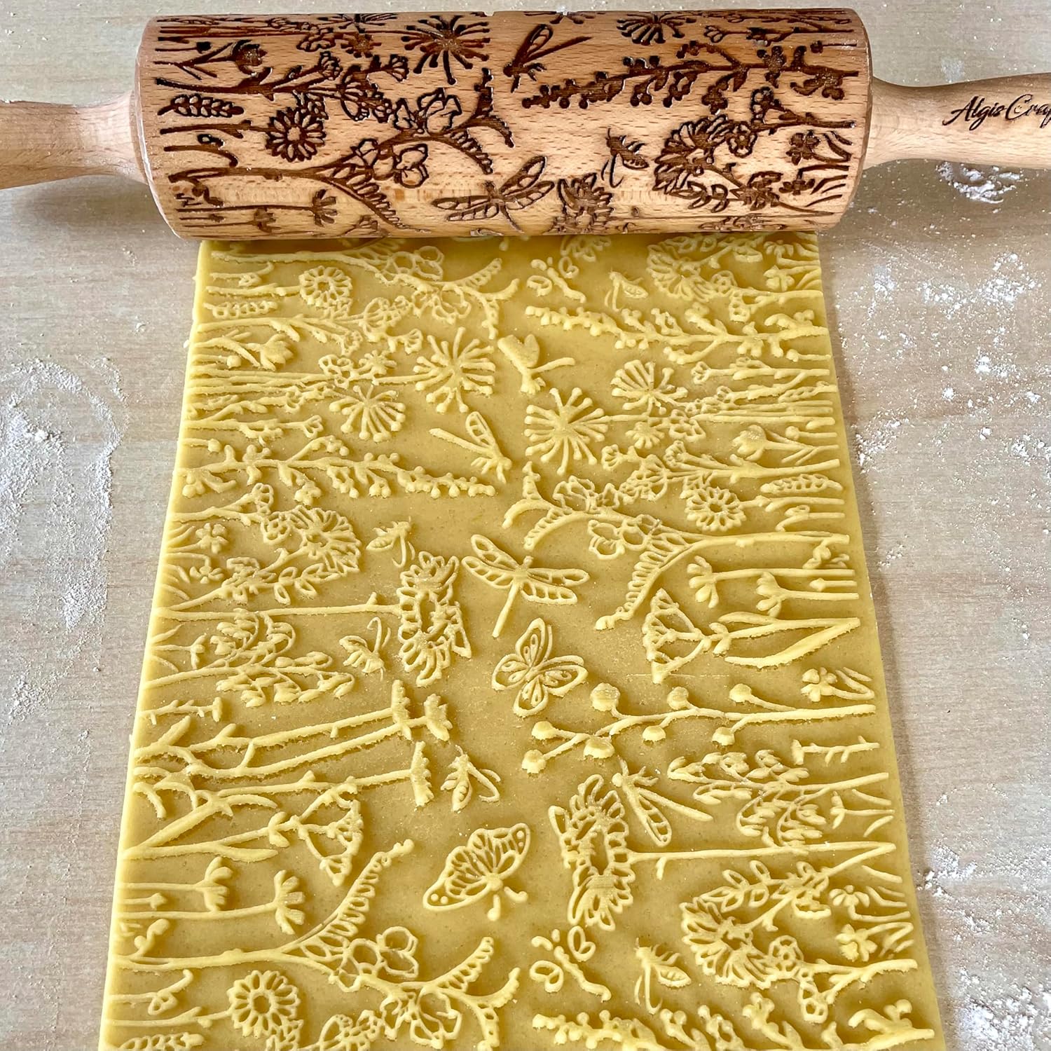 - Constructed out of highly durable Beech wood, this laser-etched rolling pin is optimally sized to roll out dough, with a large 7.9" embossing surface, 2.4" diameter, and 15.8" overall length (with handles).