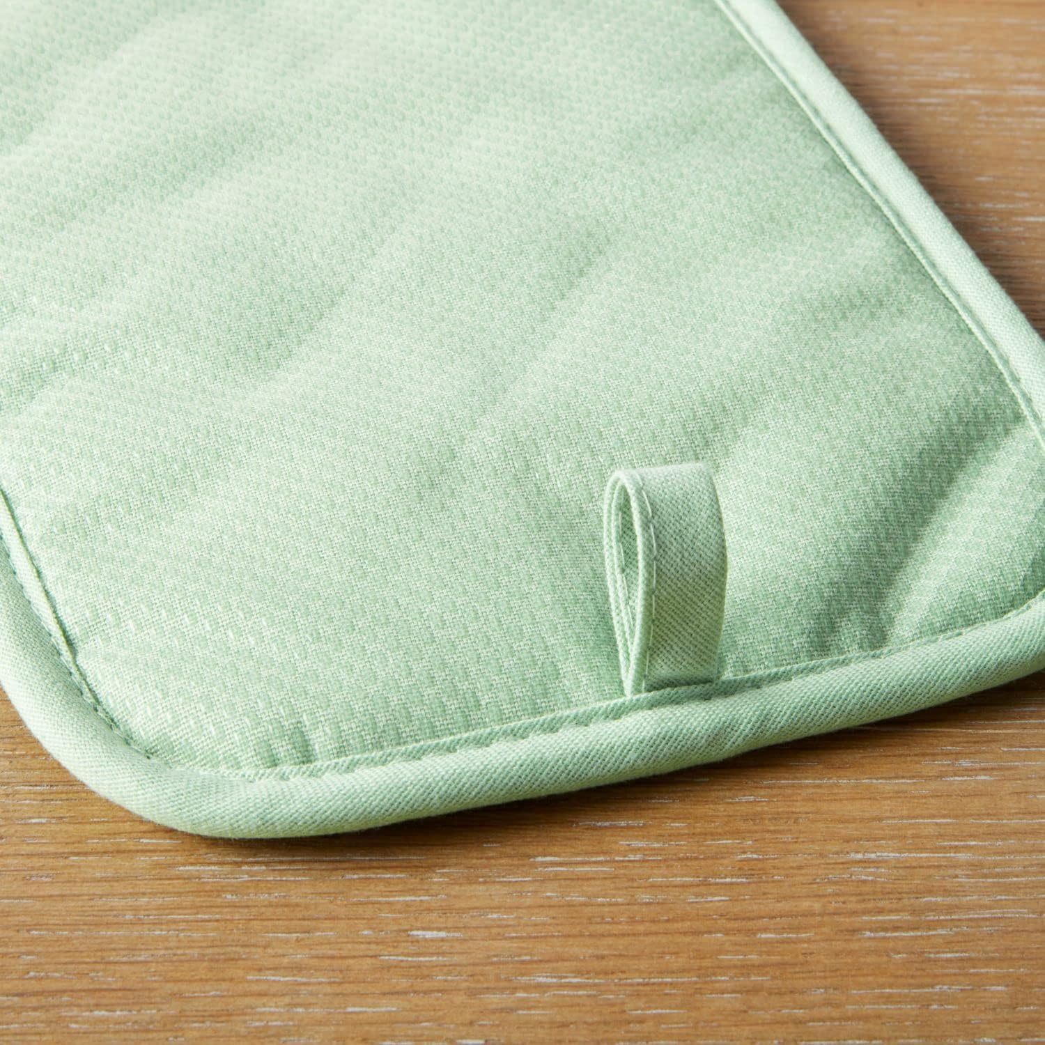 - SET OF TWO: This kitchen essentials set includes one (1) oven mitt, measuring 7" W x 13" L and one (1) pot holder, measuring 7" W x 10" L.