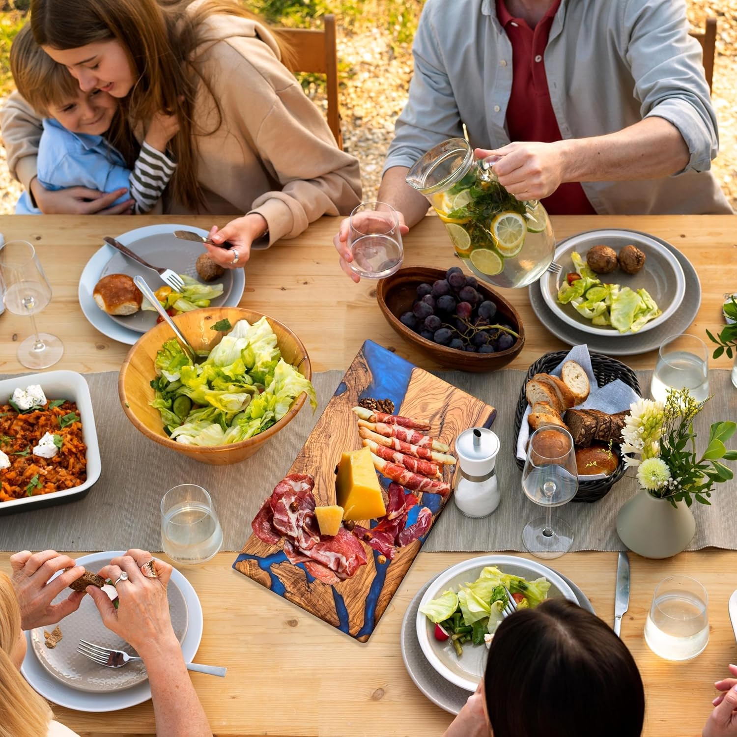 - Versatile And Elegant: You may use both sides for serving cheese, fruit and meat as an elegant and luxury olive wood charcuterie board or resin cutting board. The natural beauty of the olive grain makes these cheese charcuterie boards multifunctional for wine plates, hors d'oeuvres. Olive wood kitchen serving platter is gracious for serving, steak, pizza, fruits, sushi, bread and other appetizers. Our handmade large wooden cutting boards for kitchen make a heart-warming centrepiece on any dining table