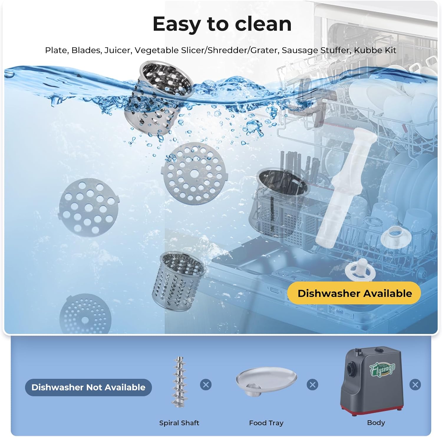 - Easy to Use & Clean: You could turn on the mince meat machine with only 1 button and start to grind meat. Also, all accessories can be removed separately for cleaning. Stainless steel blade and plates are dishwasher safe