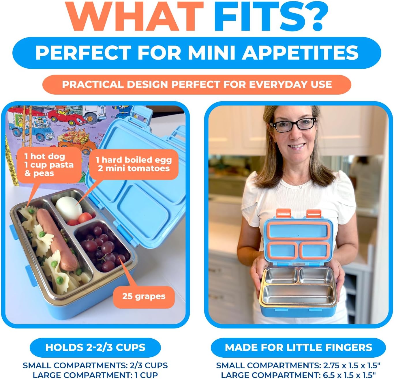 - LEAKPROOF + ECO FRIENDLY– Updated bento design with removable, dishwasher-safe steel tray! Three individual sealed metal sections make it easier to monitor how much your child is eating. Rounded corners and easy-open latches are made for small hands. Silicone seals and vacuum-release circle ensure each compartment will not spill. OPEN THE AIR RELEASE CIRCLE FIRST before opening & last when closing. You will HEAR THE AIR releasing when opening and closing properly - this confirms it is air tight.