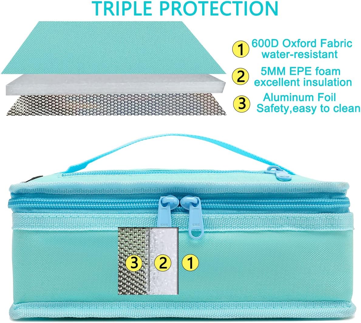 - ✿ Material:The FlowFly reusable Lunch Bag is made of the highly durable 600D Polyester,food grade aluminum foil inside, padded with extra thick 5mm PE foam and sturdy zippers.