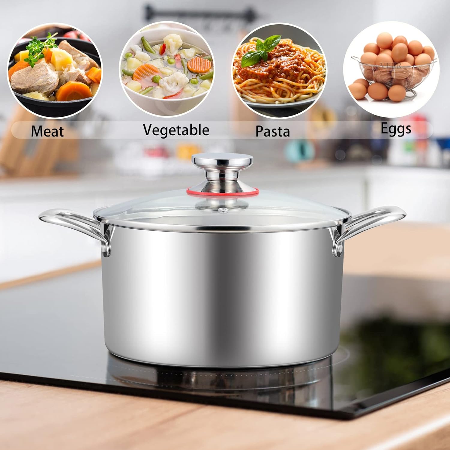 - TRI-PLY CONSTRUCTION: The whole cooking pot is made of aluminum core together with 2 layers of stainless steel, Transferring heat quickly and evenly all-around, Fit for many kinds of cooking stovetops, Included Induction, Electric, Gas, Ceramic, etc.