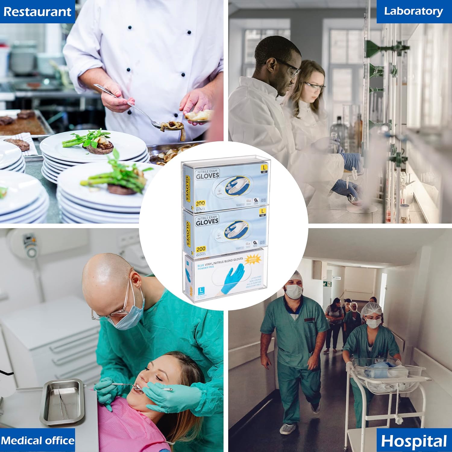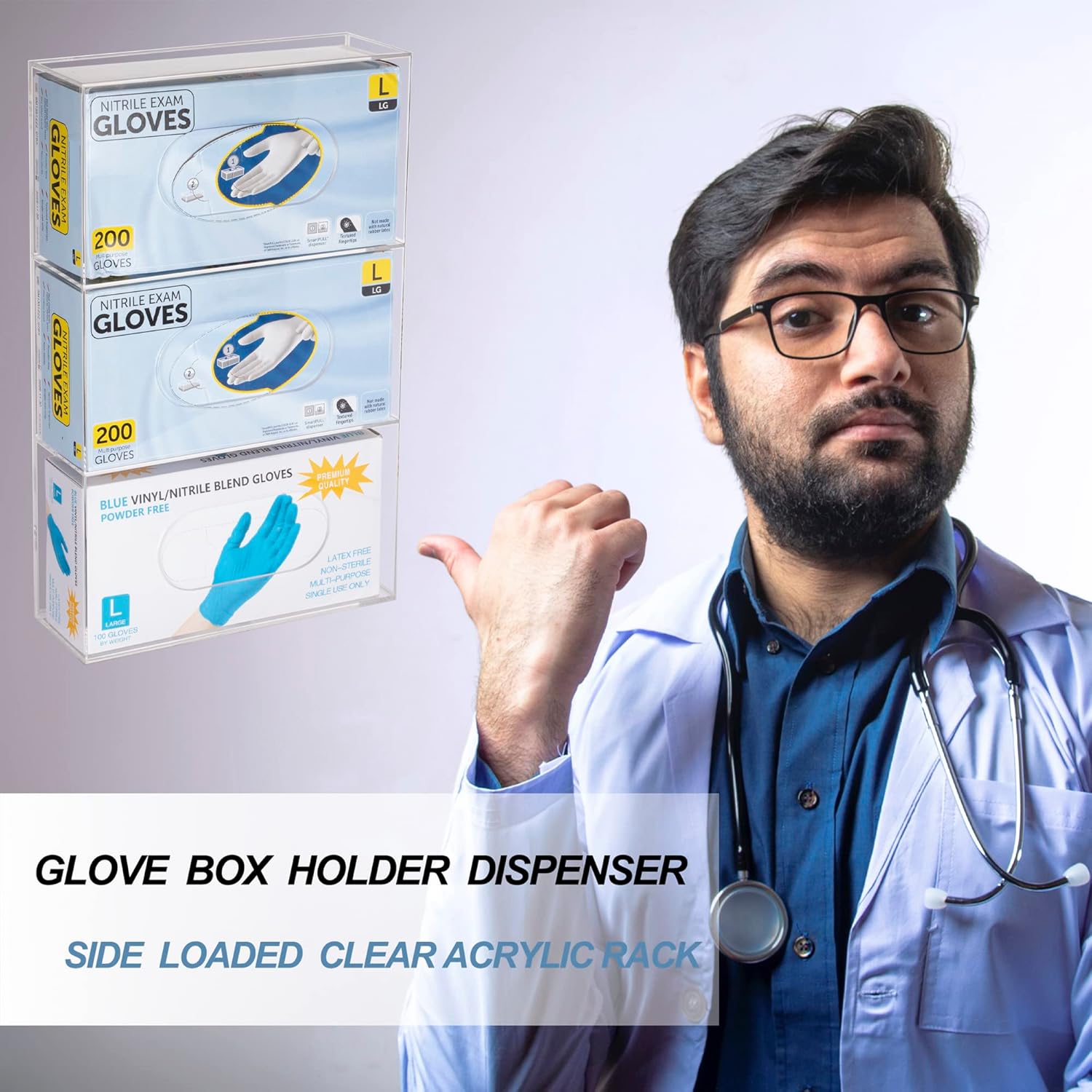 Glove Box Holder Dispenser Acrylic Triple Compartment Side Loaded Clear Rack Storage Organizer for Medical, Latex, Rubber, Nitrile, Exam, Disposable Glove Boxes Holder Standing or Wall Mount
