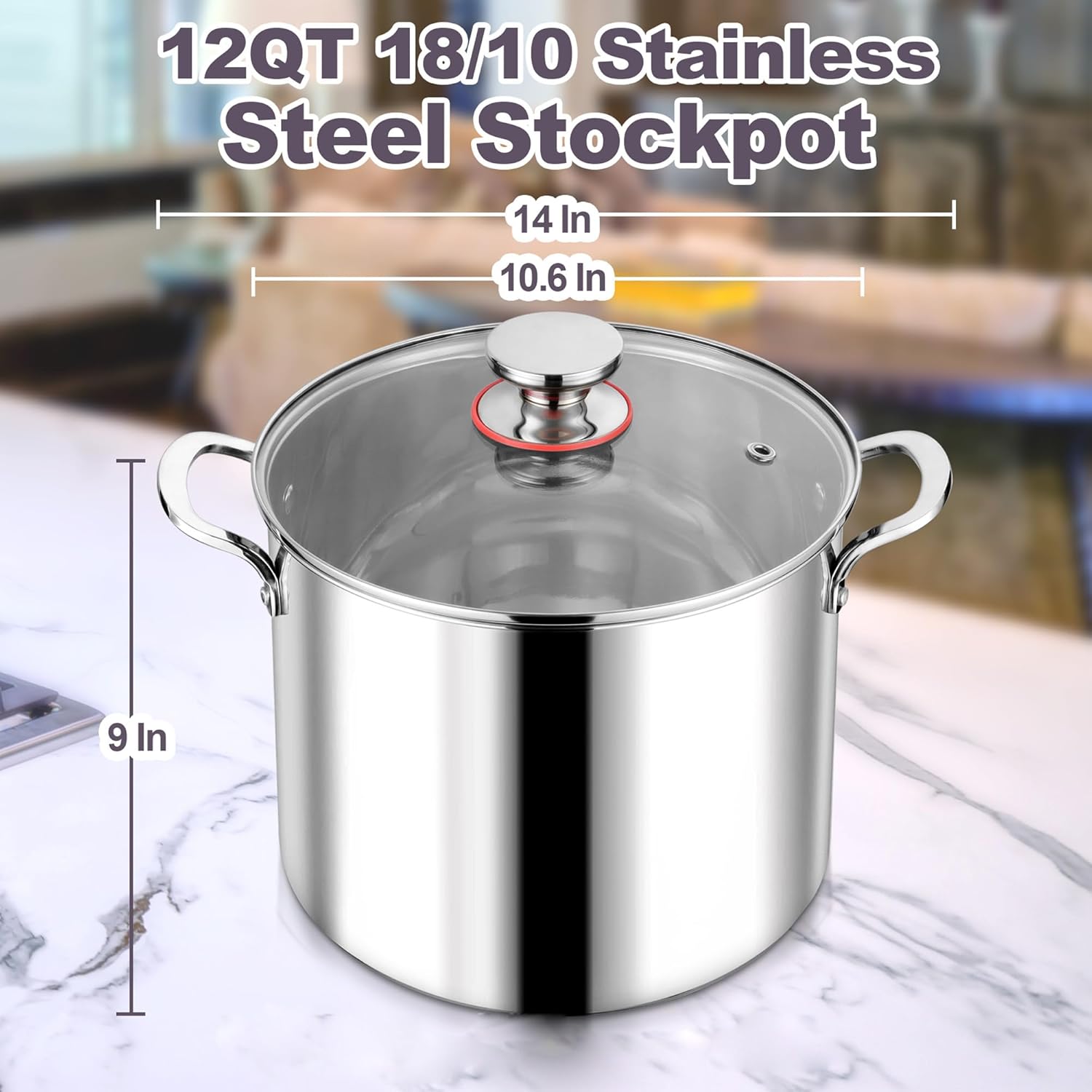 - Premium& Healthy Material, 12 quart soup stock pot is made of high quality 18/10 food grade stainless steel, it can’t chemically react to any food at high temperatures, which is non-toxic, non-allergic & safe for cooking, heavy grade stainless steel stockpot with glass lid, anti rust and warp resistant, more durable and sturdier