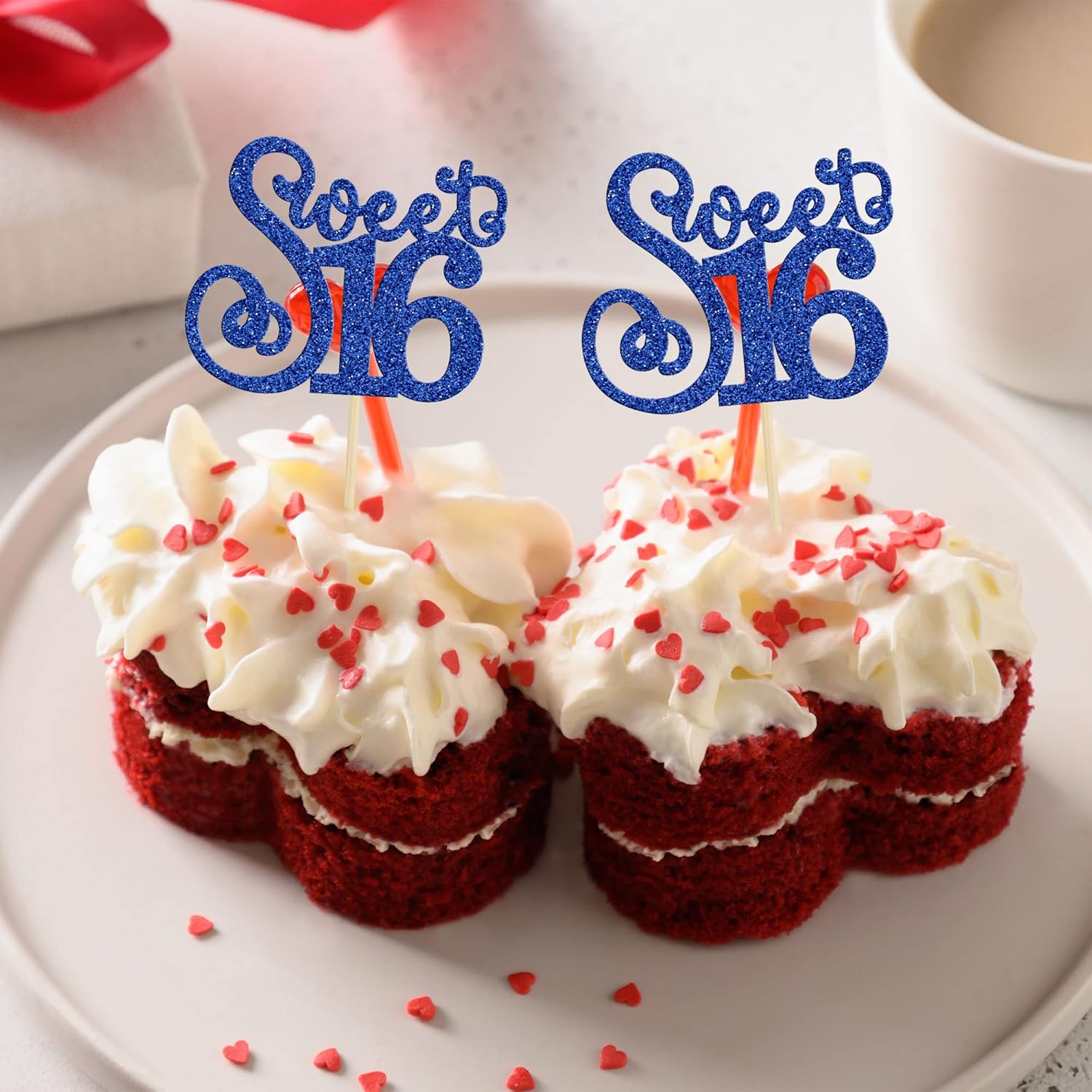 Gyufise 24 Pack 16th Birthday Cupcake Toppers Glitter Sixteen Happy Sweet 16 Cupcake Picks Cheers to 16 Years Old Cupcake Decorations for 16th Birthday Anniversary Party Cake Decorations Supplies Blue