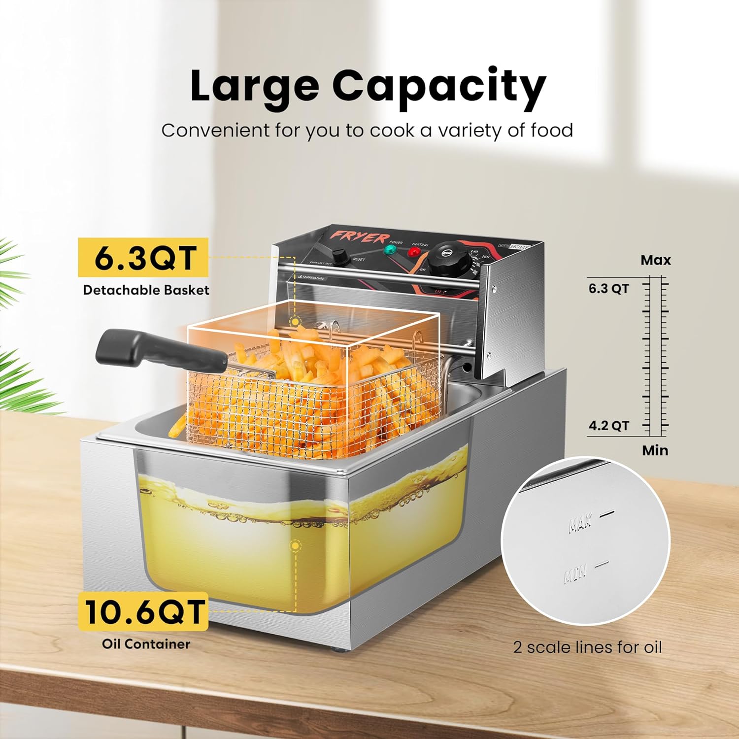 - LARGE CAPACITY - This fryer comes with a 10.6 QT oil container and a 6.3 QT detachable basket, allowing you to cook a variety of meals while swiftly discharging and removing them from the fryer; With the weight of 9.8 lbs. and the size of 17.3 x 12.2 x 11.0 inches, it can easily find a suitable spot for itself in your kitchen; The oil tank features two scale lines with a minimum capacity of 4.2 QT and a maximum capacity of 6.3 QT, ensuring safety operation and avoiding waste
