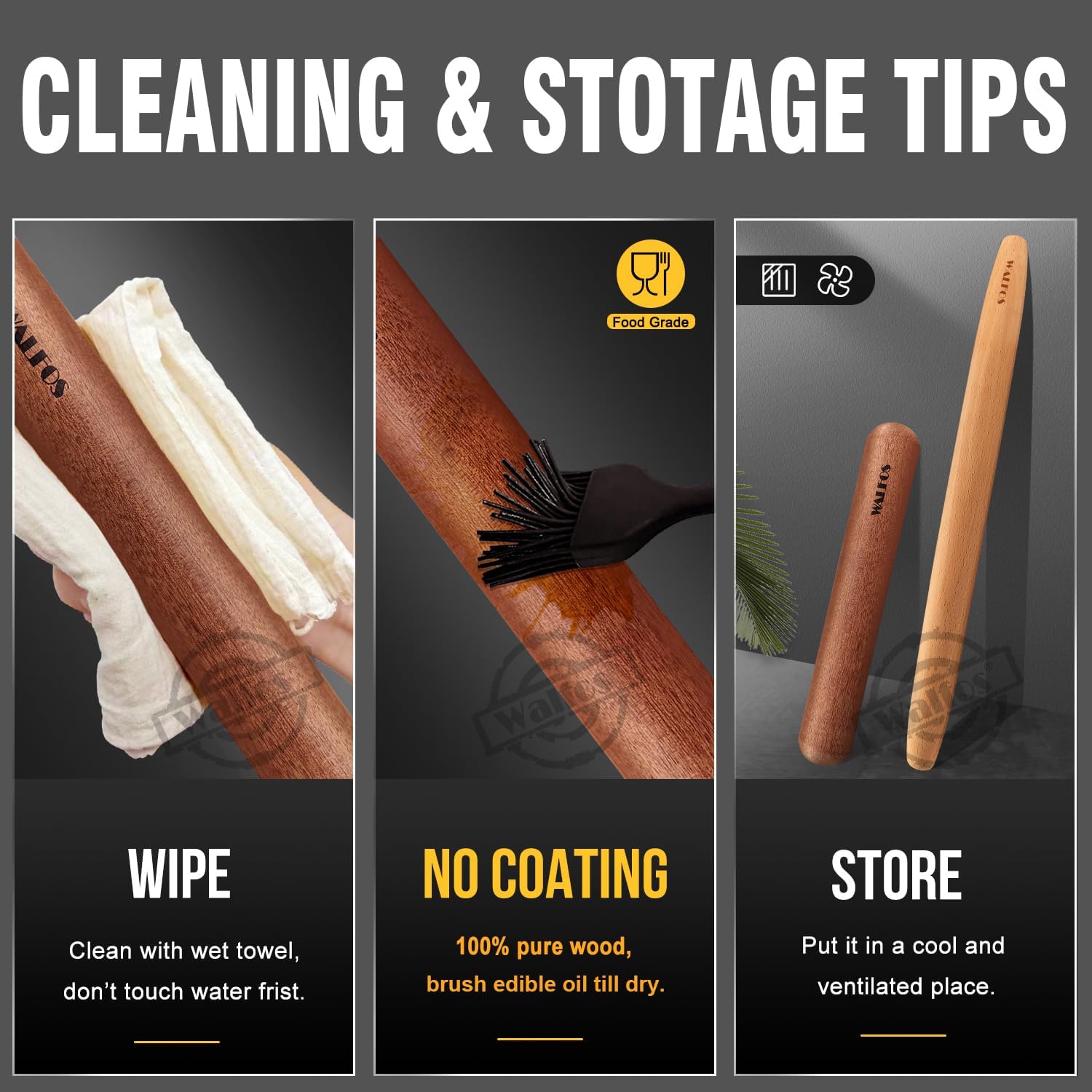 - 【NATURAL WOOD】 - Walfos natural french rolling pin set is made of premium sapele hard wood and beech hard wood without wood knot, burrs, cracks or any coating like paint and wax! They are quality and durable dough rolling pins with non-stick smooth finish, high hardness & high density, sustainable use for many years.