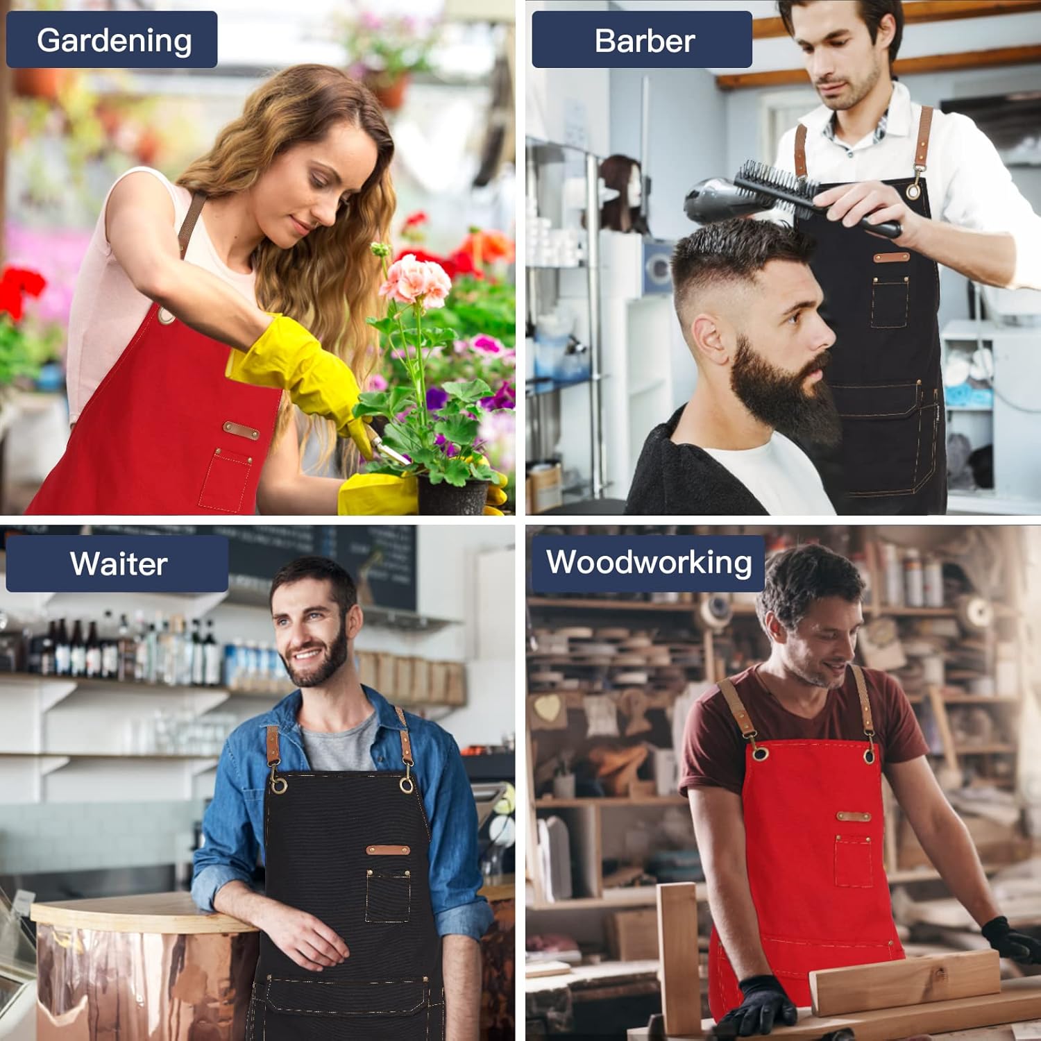 - VERSATILE & PRACTICAL: Daily life use as a Work Apron of cook, cooking, baking, grill, bbq grilling, gardening, cleaning, painting, crafting, serving, nursing, woodworking, cosmetology, hair stylist. Practical used in home, kitchen, café, restaurant, coffee shop, bar, salon, bistro, workshop, garden, flower shop, barber shop, farmhouse, etc. Ideal for cooker, baker, tavern server, art artist painter, gardener, barista, bartender, butcher teacher, florist, barber, hairdresser, waiter waitress.