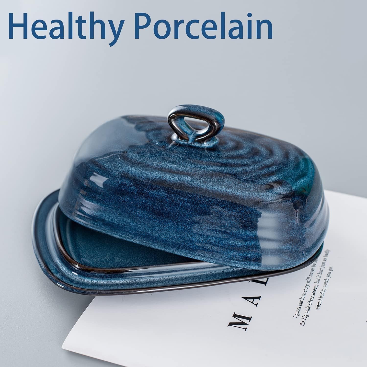Hasense Butter Dish with Lid, Porcelain Butter Container with Handle for Countertop, Large Butter Keeper & Holder with Cover for West East Coast Butter, Farmhouse Kitchen Decor for Gift, Blue