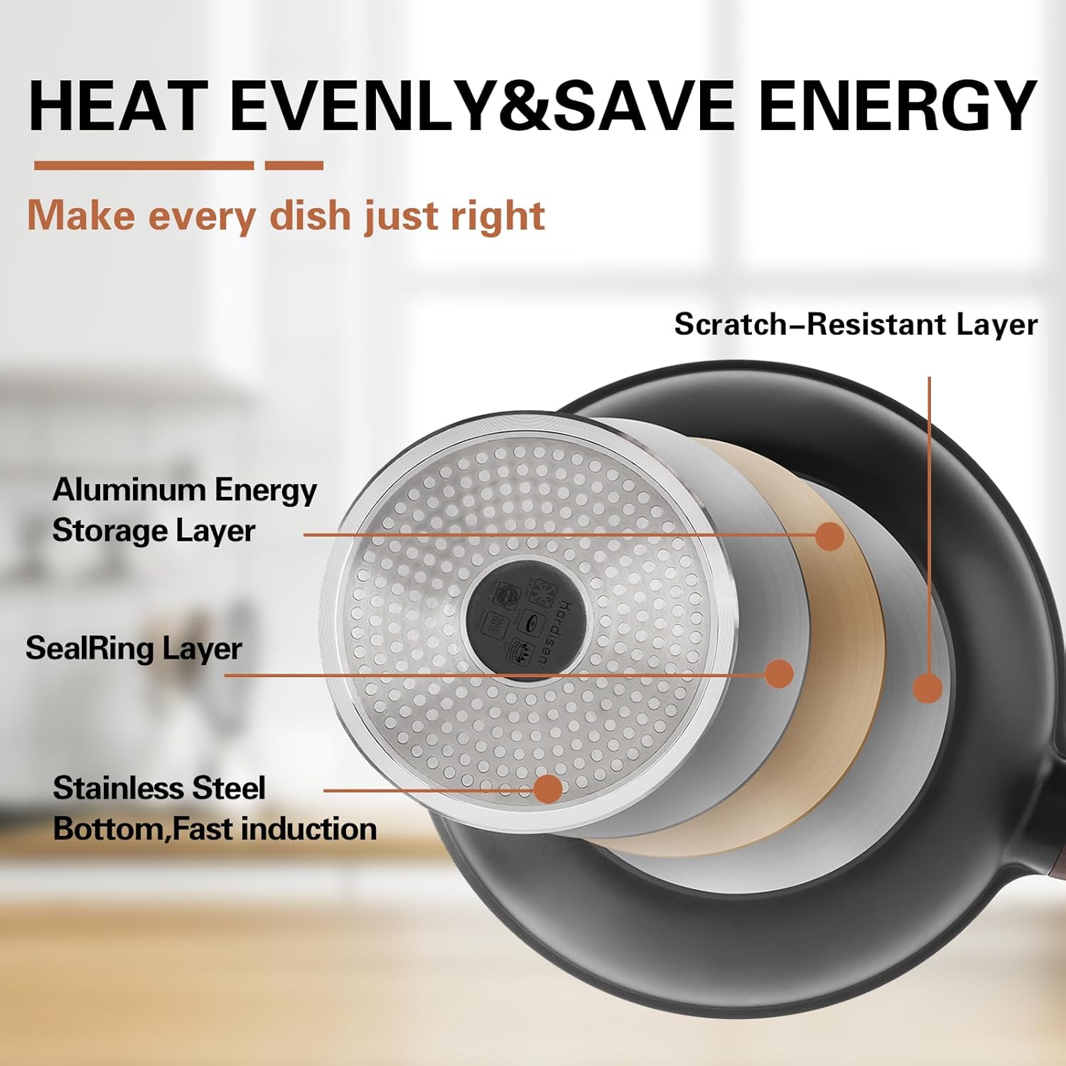 - 【All Stove Compatible】: The stir fry pan skillet is designed with a high magnetic conductive stainless steel base, making it compatible with all types of stovetops, including induction; the advanced die-casting aluminum technology prevents warping, ensures quick and even heat distribution, and saves you time and energy in the kitchen