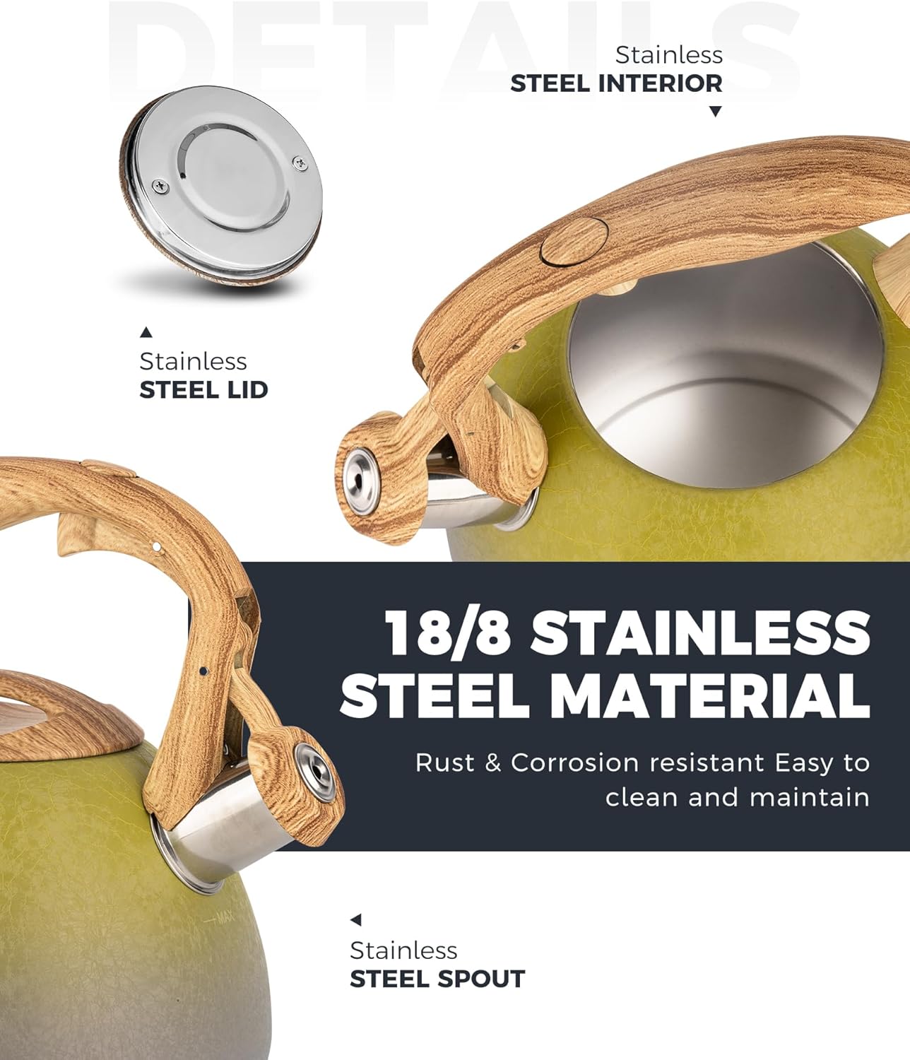 - Fast Heat Base: The tea kettle designed with a generous 8 in base can maximize the heat conduction to increase the efficiency of boiling. High grade stainless steel is suitable for any heat source including gas, electric and induction.