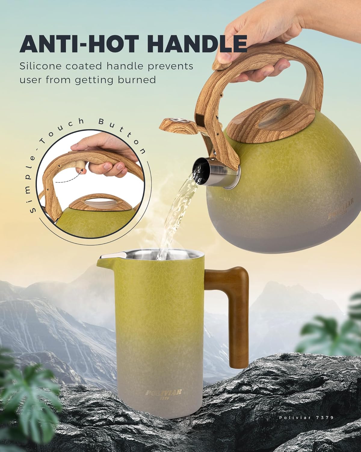 - Anti-Hot Handle: Silicone coated handle allows you to grab the teapot without risking burns. The ergonomic shape maximaze your comfort to lift and pour. Simple touch button provides easy open & close to make one hand pouring possible.
