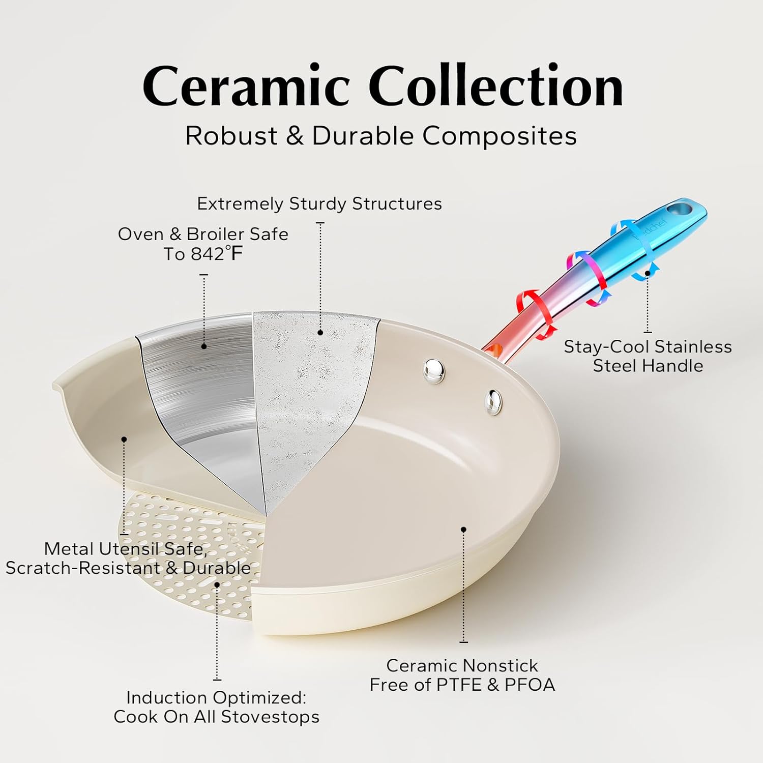 - COOL & STURDY HANDLE: Crafted from lightweight, precision-pressed stainless steel, this ergonomically designed handle ensures a comfortable grip. Double-riveted for exceptional strength and maneuverability, ceramic saute pan empowers you to seamlessly transition from stovetop to oven, allowing you to achieve that flawless sear, brown toppings, or even bake