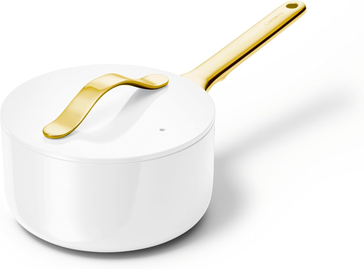 Caraway Nonstick Ceramic Sauce Pan with Lid (1.75 qt) - Non Toxic, PTFE & PFOA Free - Oven Safe & Compatible with All Stovetops (Gas, Electric & Induction) - White