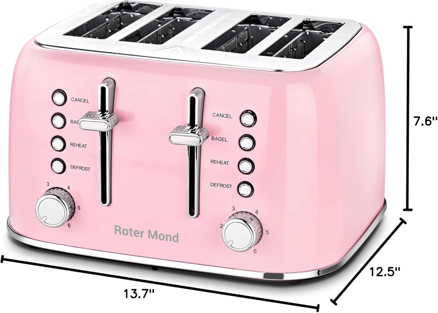 - Delicate Design: Retor Mond retro toaster 4 slice perfectly fits your kitchen environment and also creates perfect valentine vibes. It is also a great gift for Christmas, birthdays, thanksgiving, weddings, etc. Stainless steel surface with premium paint brings a slice of color to any corner of your house. High lift design provides more protection to avoid burnt risk when removing bread. Pull the removable trays at the bottom to dump crumbs after toasting, pretty easy to clean