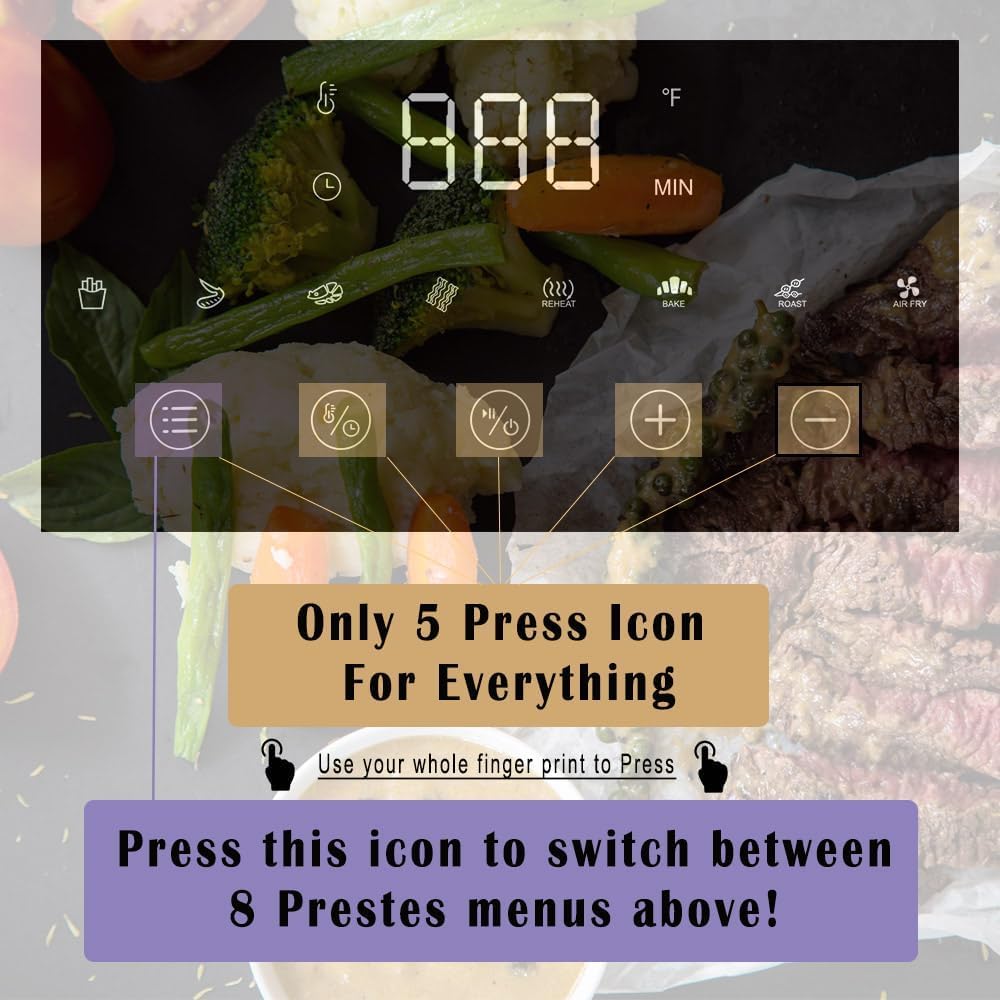 - EIGHT PRESETS VERSATILE AND CUSTOMIZATION: This multi-functional elecric air frier comes equipped with 8 buttons, offering a variety of cooking options with Default Reference Temperature & Time: Four common kitchen foods and Four essential kitchen functions; With adjustable time and temperature settings, you can customize your own recipes. This feature allows you to experiment with different cooking techniques to create your own culinary food and share the joy with your family.