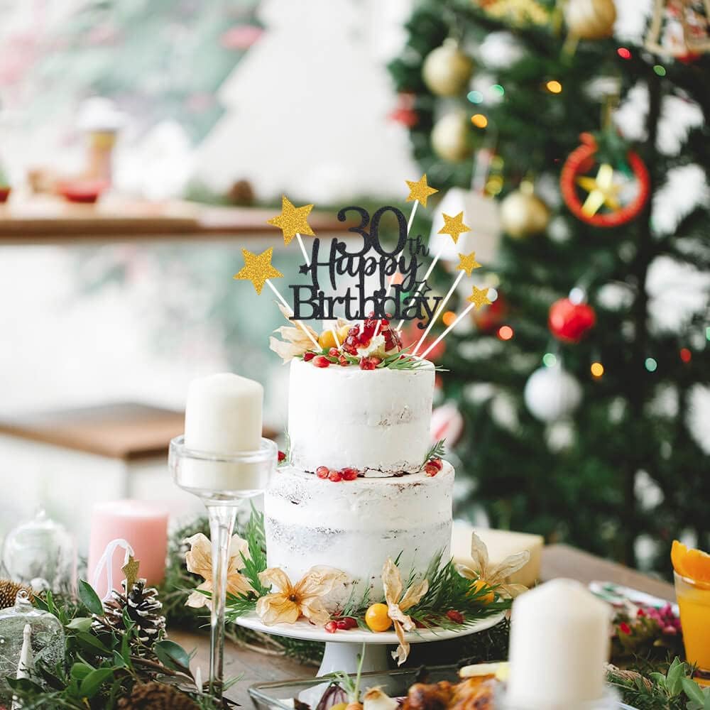 Glittery 30th Happy Birthday Cake Topper with Star,Personalised 30 Birthday Cake Toppers Party Decorations Party Supplies for Men Women Black Gold