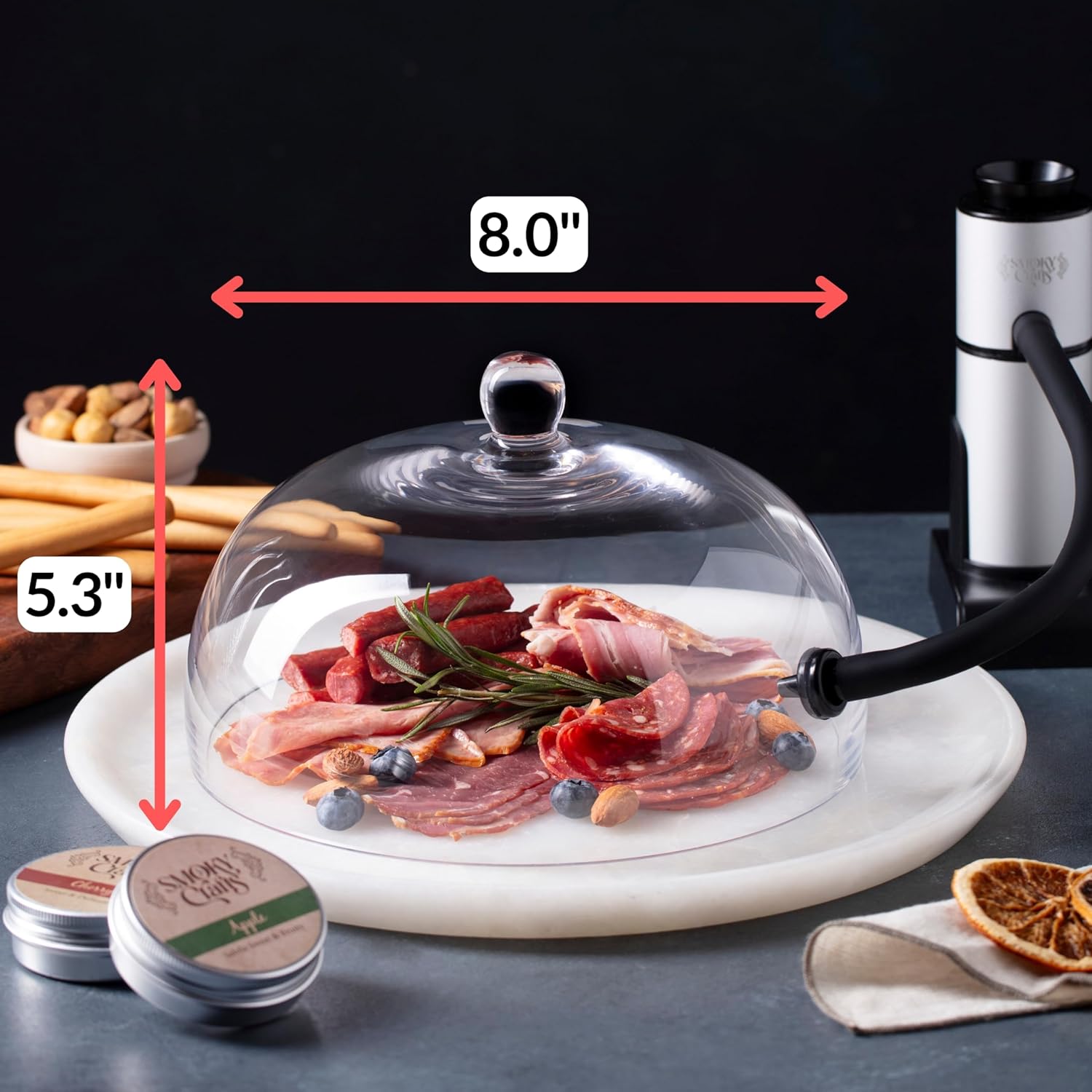 Food and Drink Smoker Kit with Smoke Gun, 8" Smoking Cloche Glass Dome, Acacia Cocktail Smoke Top and Wood Chips (Apple & Cherry) - Whiskey Smoker Kit - Gifts for Men (Torch Not Required)