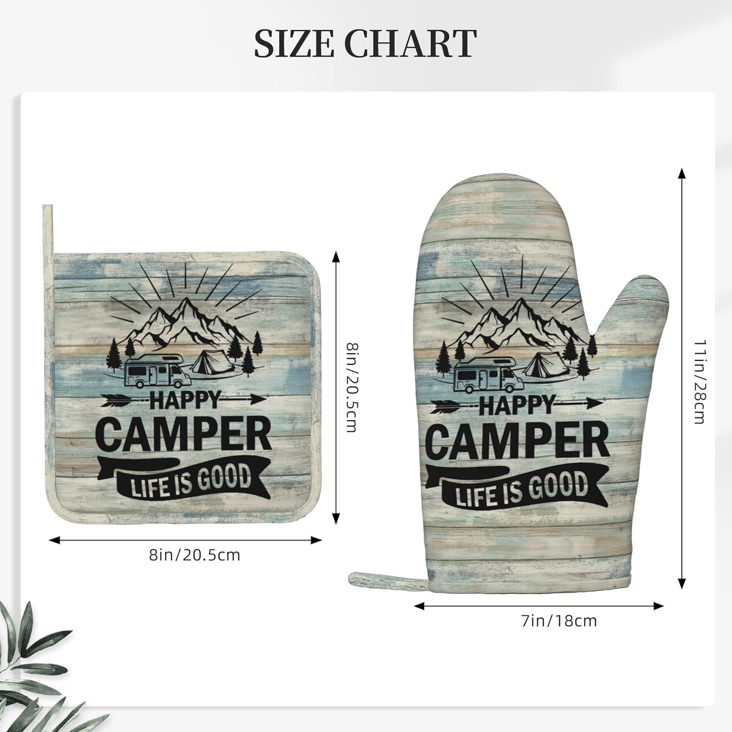 Happy Camper Oven Mitts and Pot Holders Sets of 4,Resistant Hot Pads with Silicone Non-Slip BBQ Gloves for Kitchen,Cooking,Baking,Grilling