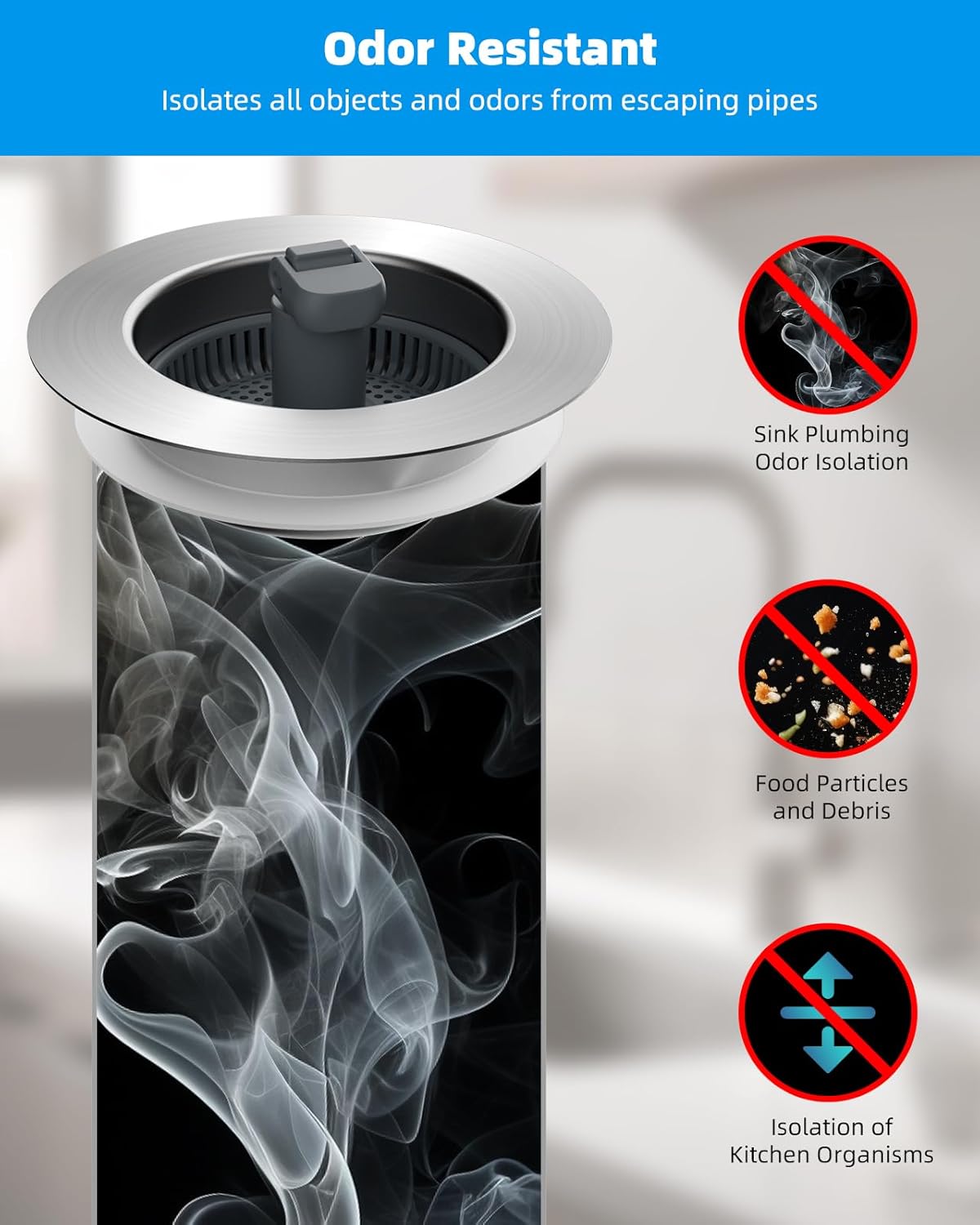 - Versatile 3-in-1 Design: This sink strainer combines water storage, strainer and smell isolation; With multi-layer sealing gaskets, this sink stopper ensures leak-proof water storage while effectively isolating kitchen drain smell; It can be used to fill the sink with water for cleaning and soaking purposes; The perforated basket allows easy filtration of kitchen waste without impeding water flow, which can easily captures food, waste and debris to prevents clogging in kitchen pipe