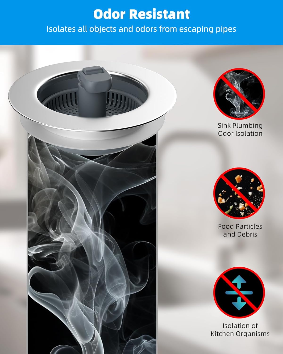 - Versatile 3-in-1 Design: This sink strainer combines water storage, strainer and smell isolation; With multi-layer sealing gaskets, this sink stopper ensures leak-proof water storage while effectively isolating kitchen drain smell; It can be used to fill the sink with water for cleaning and soaking purposes; The perforated basket allows easy filtration of kitchen waste without impeding water flow, which can easily captures food, waste and debris to prevents clogging in kitchen pipe
