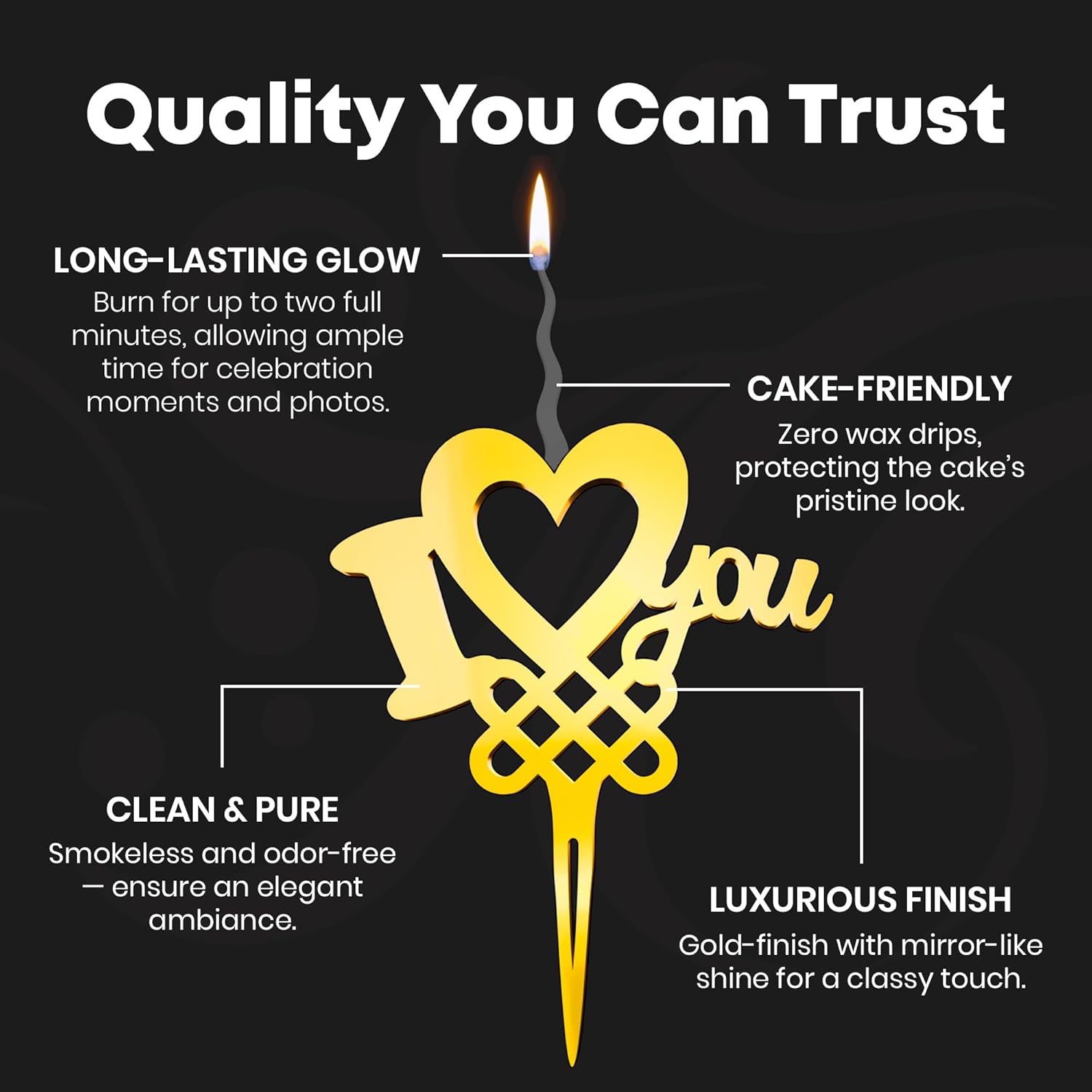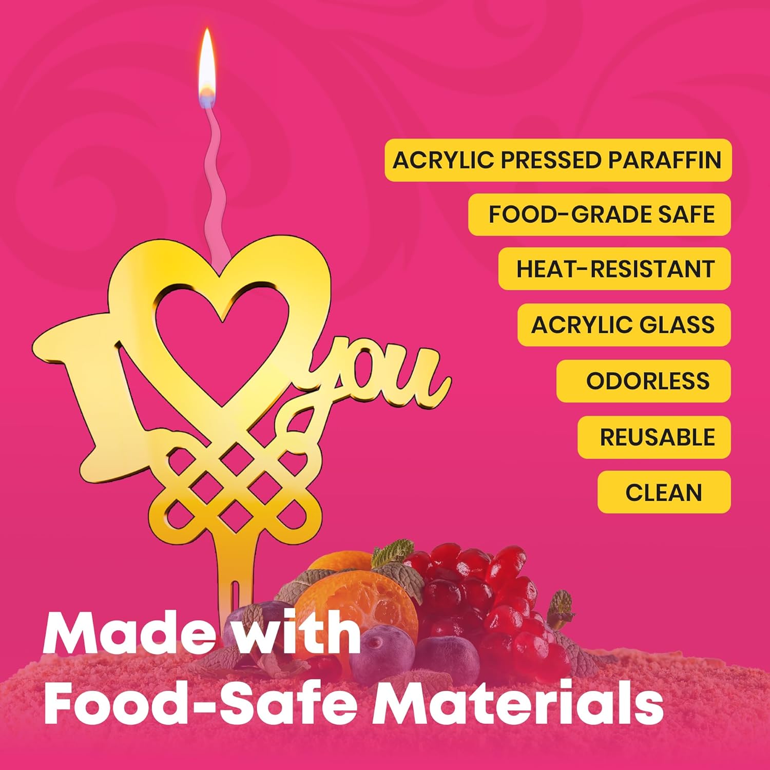 I Love You Reusable Gold Romantic Cake Candle - Luxury Cake Topper Candle for Birthdays, Weddings & Anniversaries - Reusable Food Safe Acrylic, Shiny Mirror Finish - Happy Birthday Cake Topper Decor