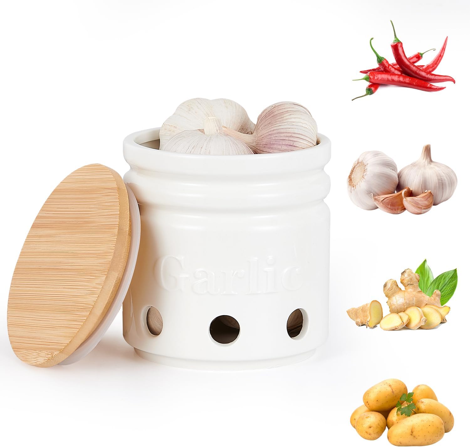 - 【SIMPLE DESIGN】:The garlic container composed of white ceramic and bamboo lid is elegant and durable. It is a little helper on the kitchen countertop. It can be used in homes, cafes, restaurants and other scenes, and can also be used as a housewarming gift.