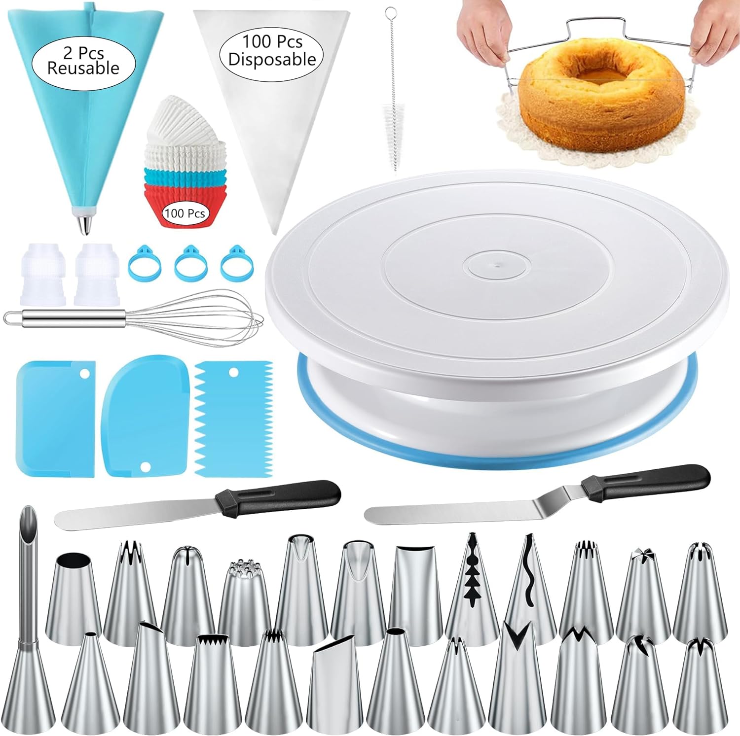 - 【Cake Decorating Tools】This baking supplies has everything you need to create beautiful cakes, including 11 Inch 360° Cake Turntable✔24 Icing Tips✔100 Disposable Pastry Bags✔2 Reusable Icing Bag✔3 Cake Scrapers✔2 Spatulas✔1 Cake Leveler✔100 Cupcake liner✔3 Couplers✔3 Pastry Bag Ties✔1 Tips Cleaning Brush