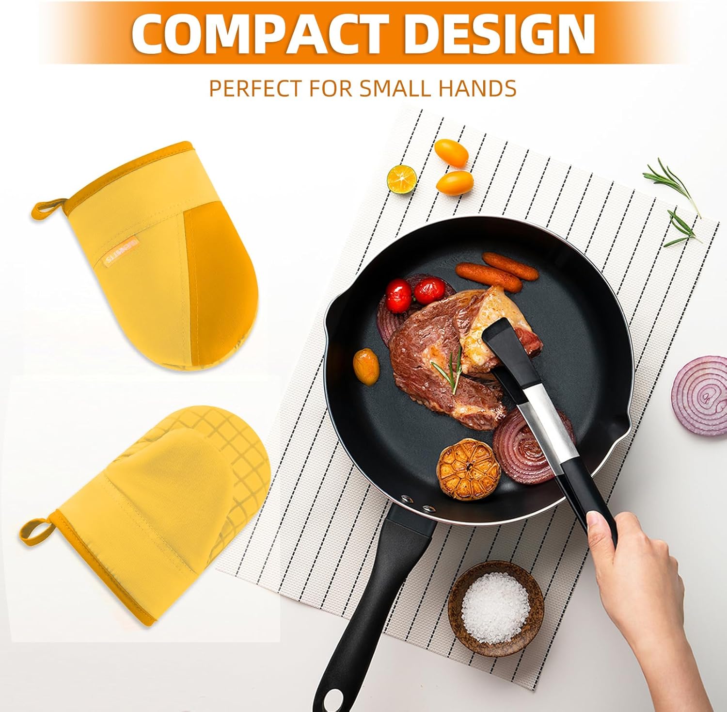 - 1 PAIR MINI SIZE OVEN MITTS: The size of the oven mitts is 7.7x5.3 in(L x W). A simple and practical design can fit the palm better. The mini design makes kitchen mittens take off and wear more conveniently.
